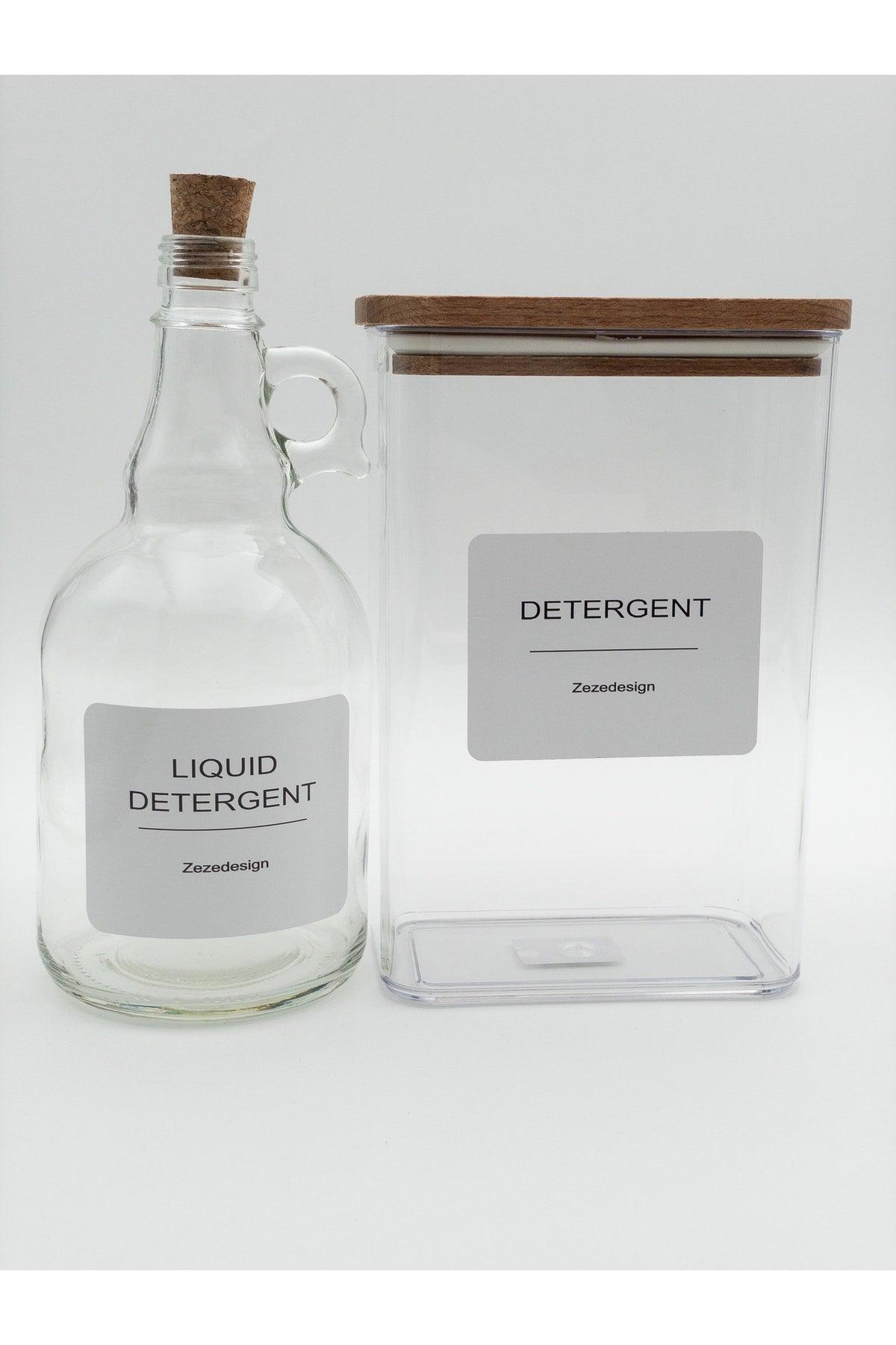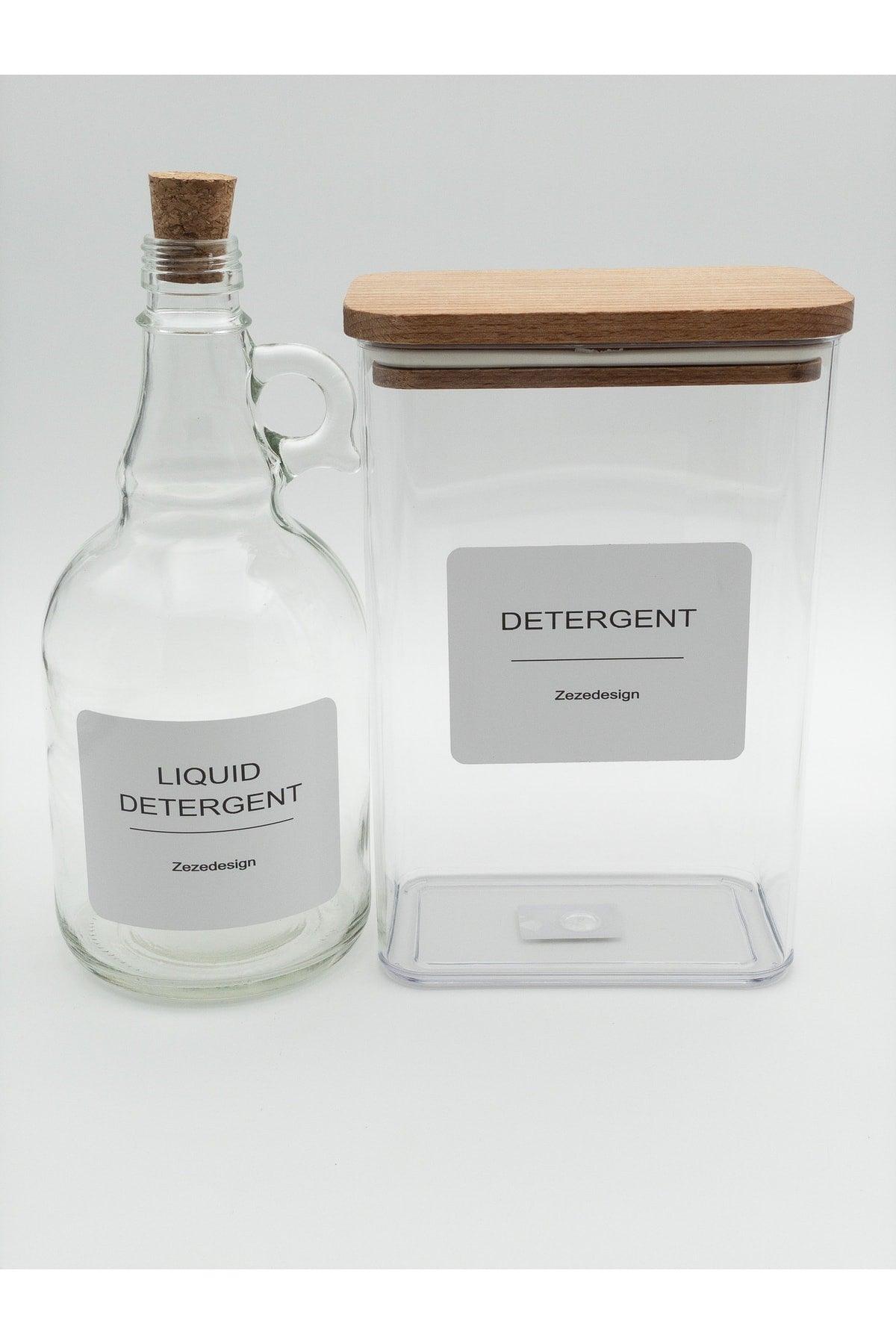 مجموعة من 3 - برطمان مسحوق غسيل بغطاء خشبي وزجاجة منظف سائل مع غطاء من الفلين