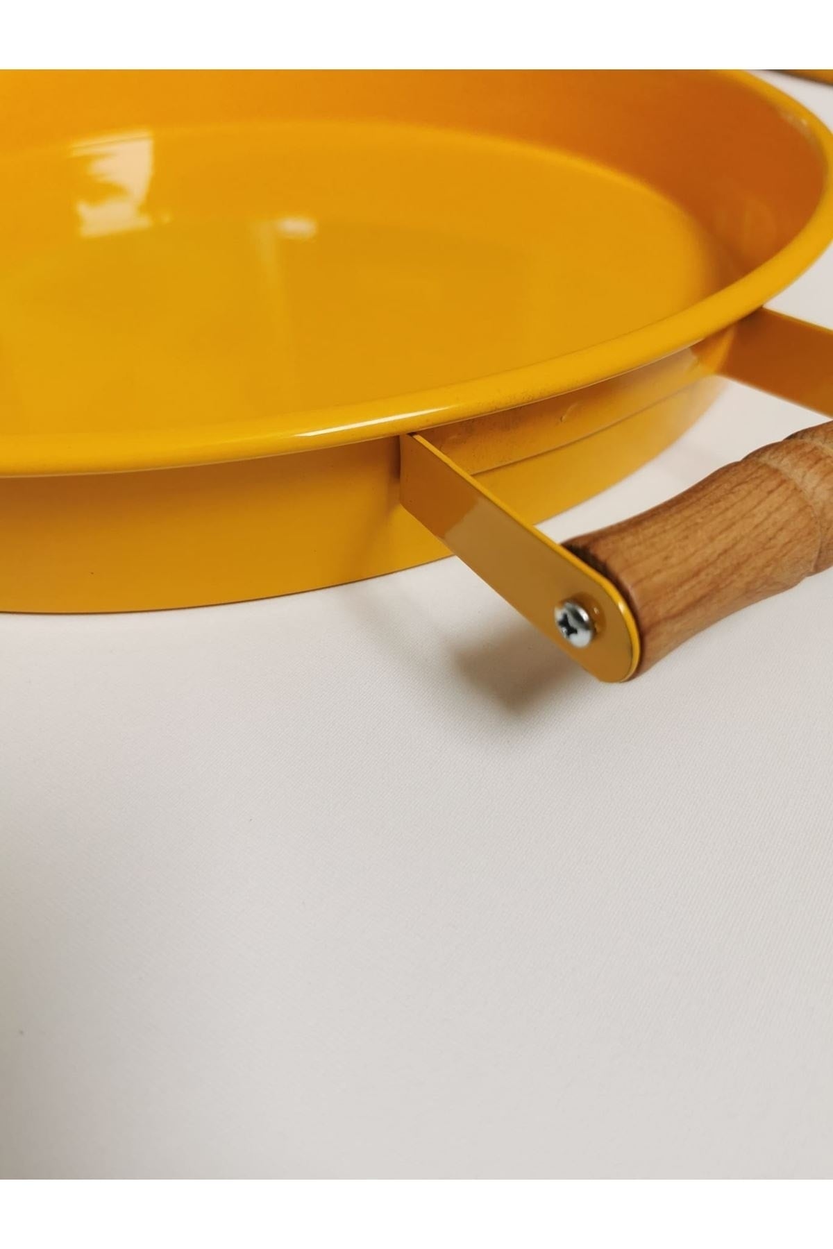 صينية تقديم دائرية معدنية صفراء بمقبض خشبي سعة 2 لتر، 51 سم و37 سم، صينية إفطار