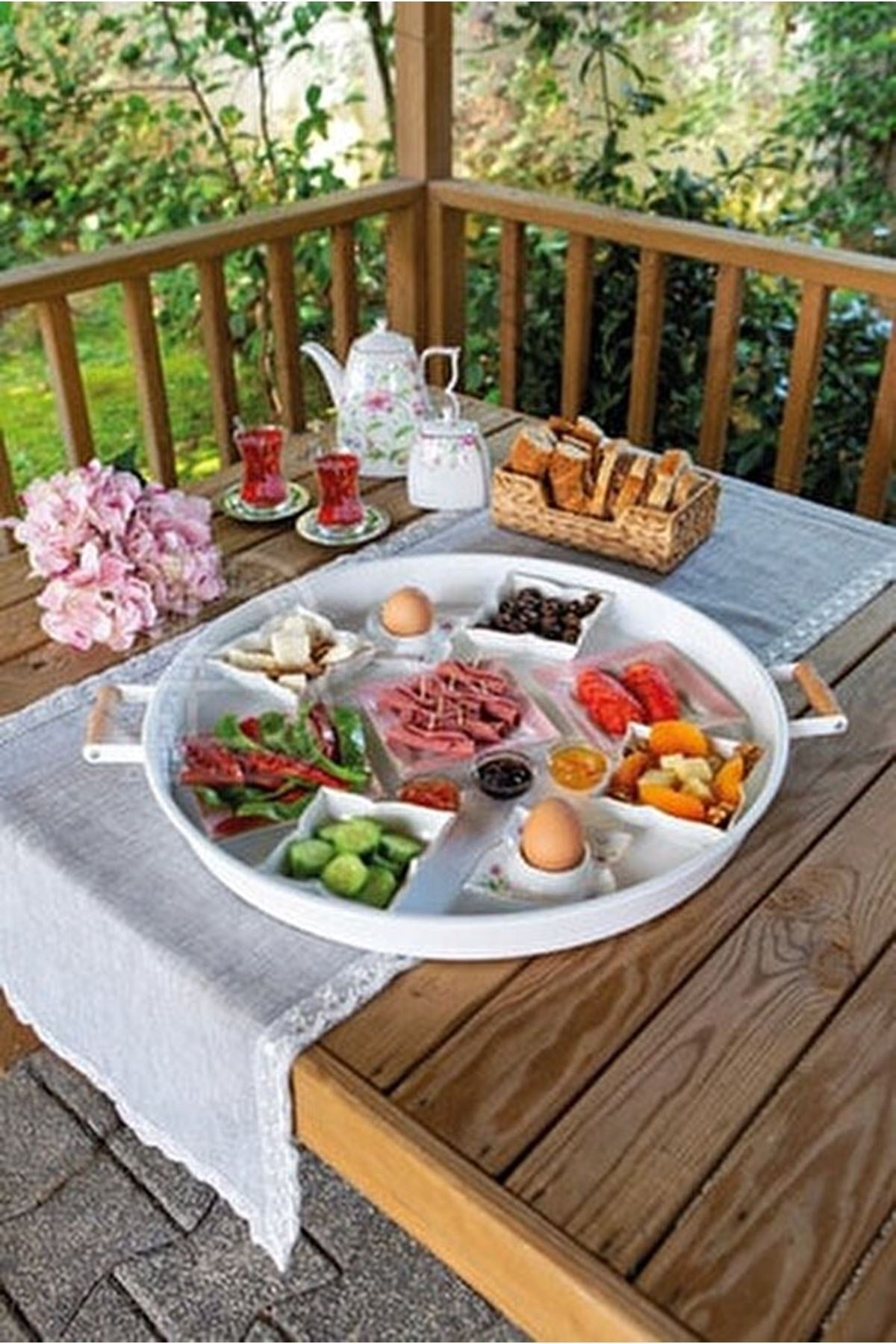 صينيتان معدنيتان بمقبض خشبي مقاس 51 سم وصينية بيضاء مقاس 37 سم لتقديم الشاي والقهوة
