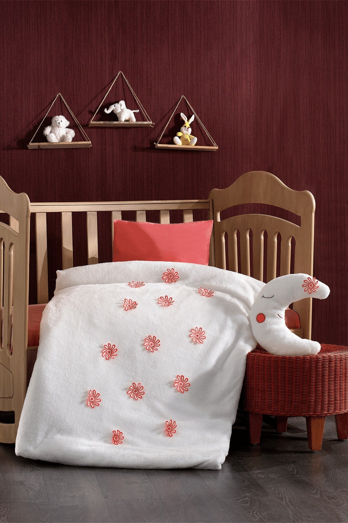 طقم غطاء لحاف للأطفال من 4 قطع، مصنوع من القطن بنسبة 100%، بنقشة زهور ثلاثية الأبعاد ونقشة زهور الرمان المبطنة على شكل قمر