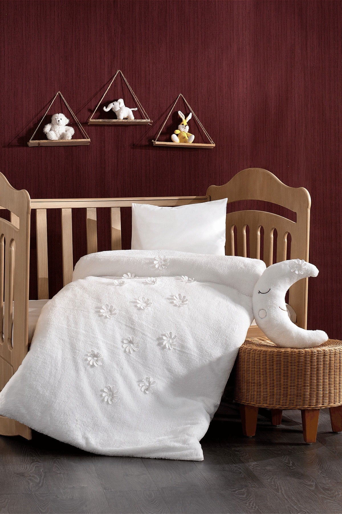 طقم غطاء لحاف أبيض للأطفال مكون من 4 قطع من القطن بنسبة 100% بنقشة زهور ثلاثية الأبعاد ووسادة قمرية