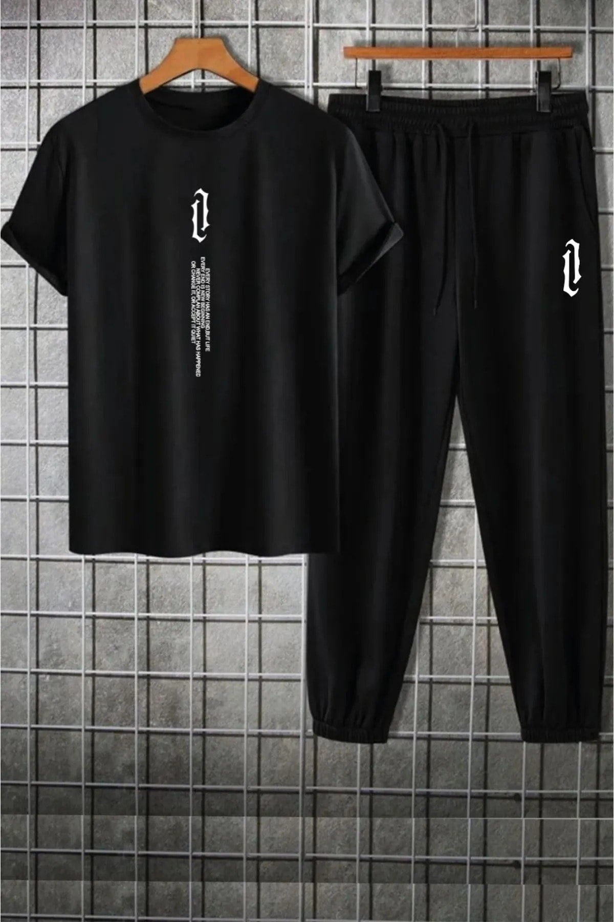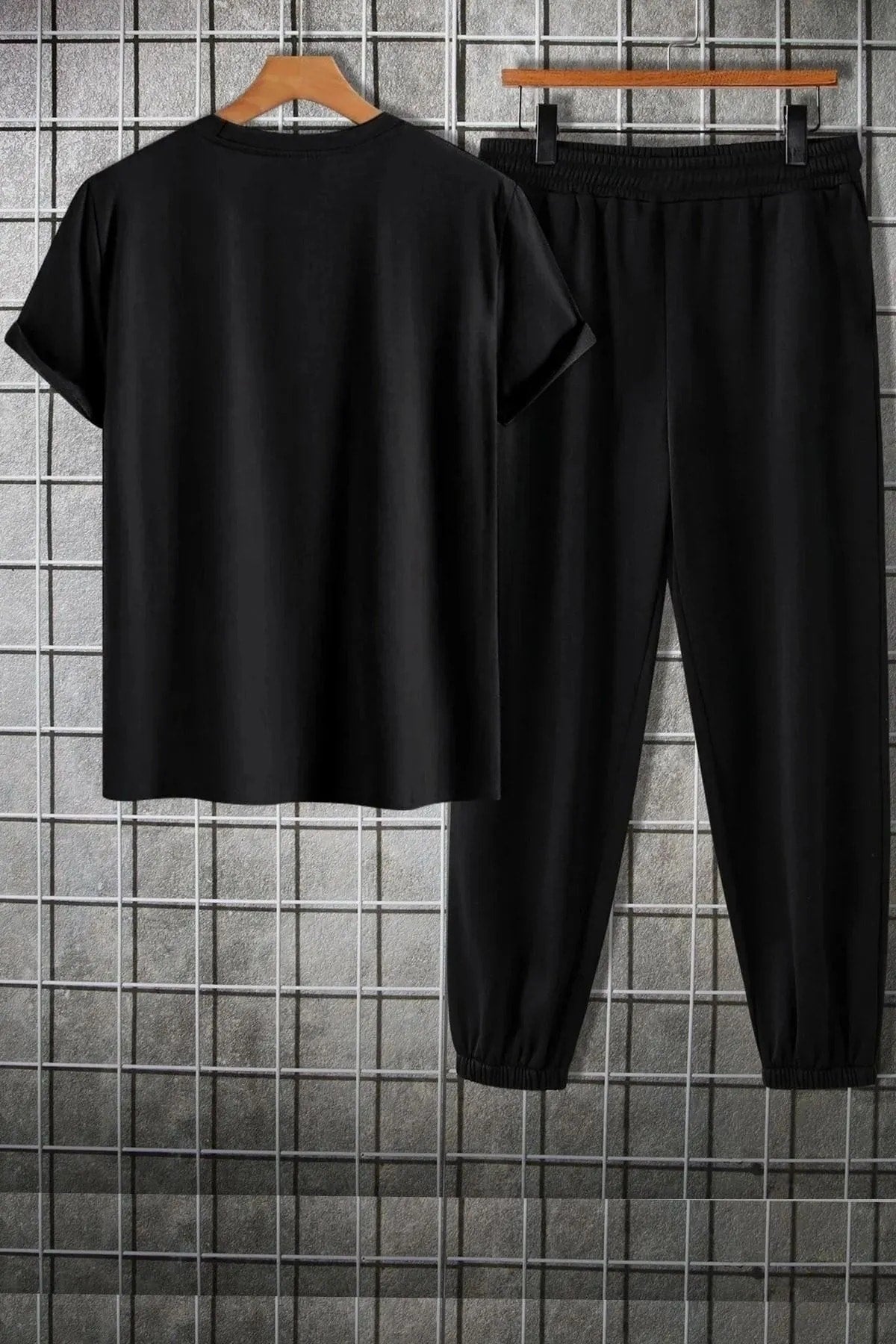 طقم تي شيرت رياضي رجالي أسود كبير الحجم بتصميم عمودي