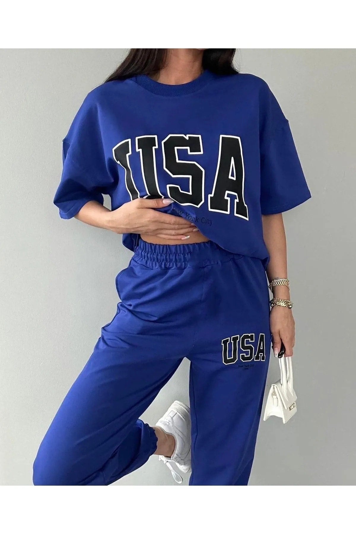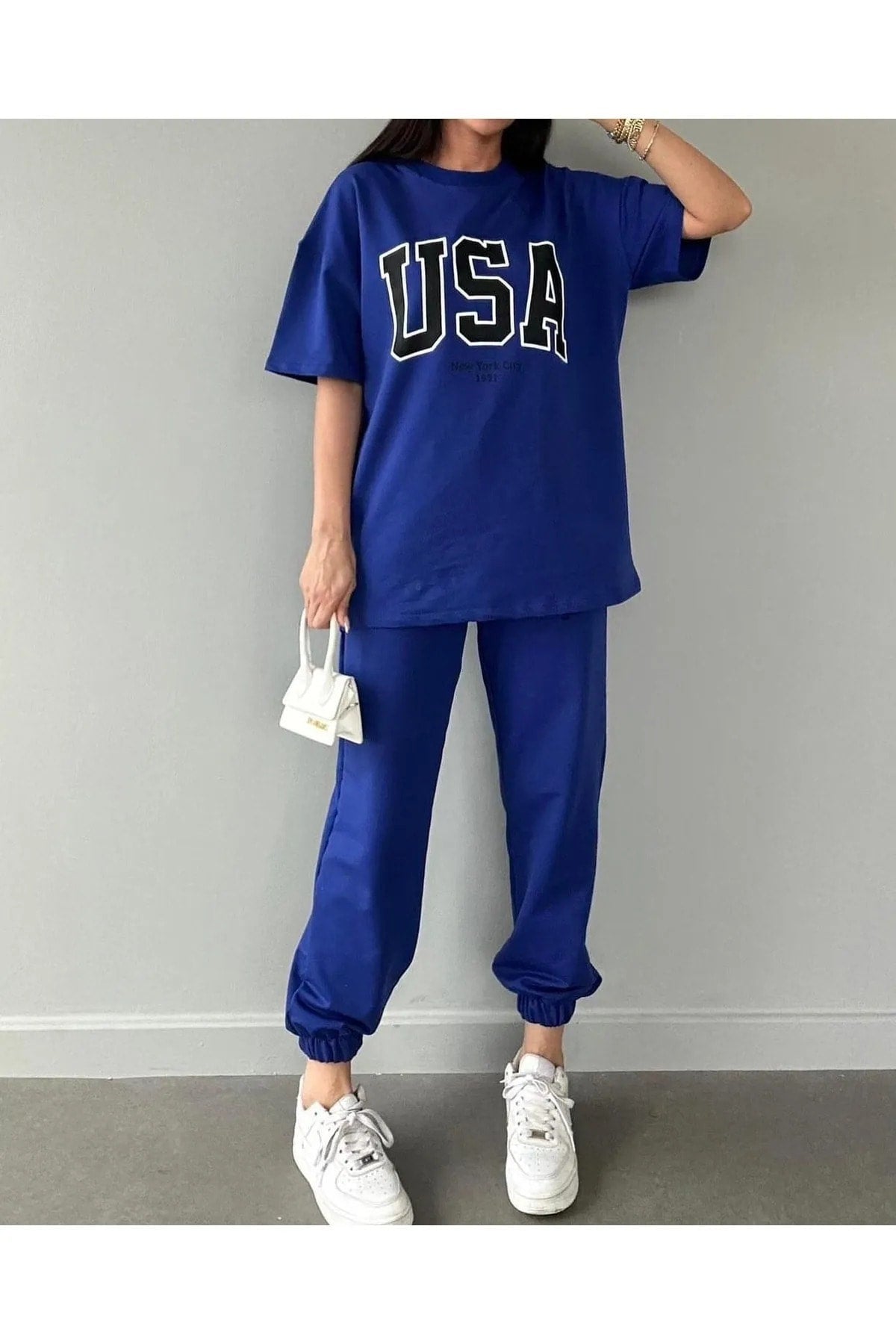 تي شيرت، بنطال رياضي، بنطال رياضي، أزرق، مطبوع، من الأسفل إلى الأعلى، بدلة رياضية، مقاس كبير، رقبة دائرية