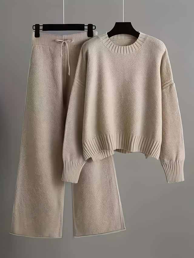 Ladies' Early Autumn New Sweater Fashion Two-piece Set: Unique Pattern Round Neck Drop Shoulder Long Sleeve Pullover + Straight Wide Leg Pants Combination, Loose And Casual Series