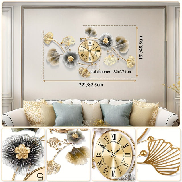 Wall Clocks for Living Room Decor, Large Wall Clock, 3D Creative Metal Ginkgo Leaf Design, with Silent Movement Wall Clocks for Home Wall Decor Clock
