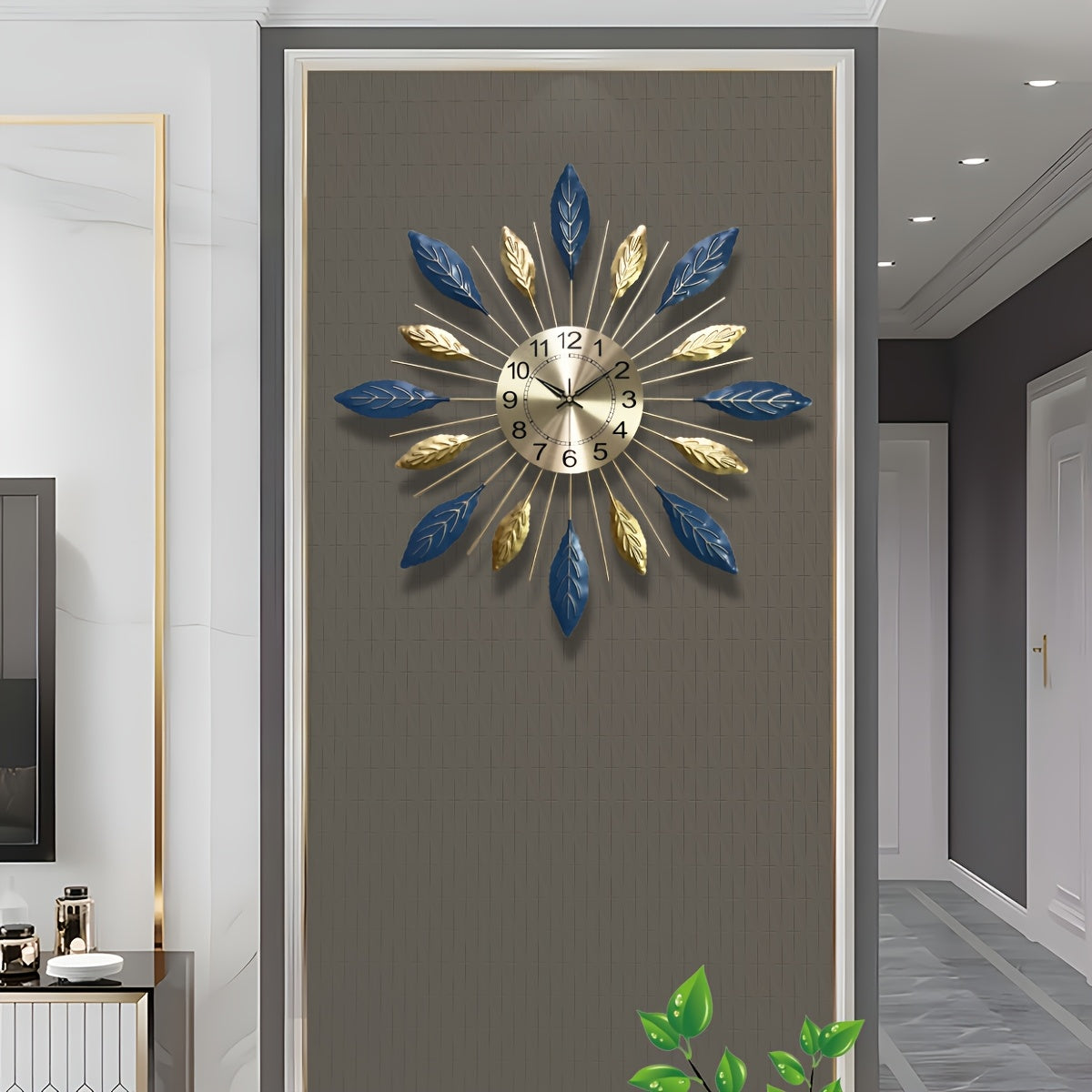 29" Large 3D Metal Leaf Wall Clock, Silent Quartz Movement, Golden & Blue Leaf Design, Handmade Country Garden Decor, Stylish and Creative Art for Indoor & Outdoor Use, Wall Clock Living Room
