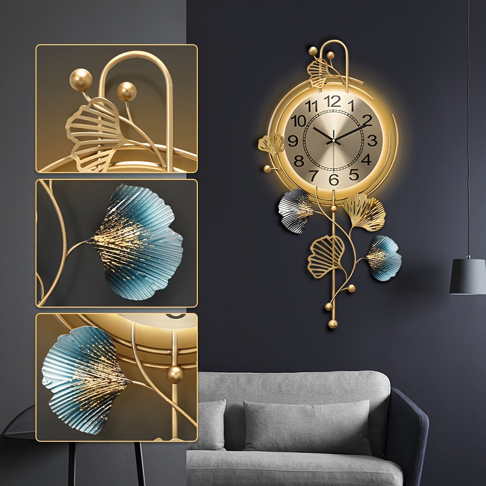 31" x 14" Modern Silent Golden Metal Large Ginkgo Leaf Wall Clock - Creative Decorative Clock for Living Room, Kitchen, Entryway, Bedroom, Office, Dining Room
