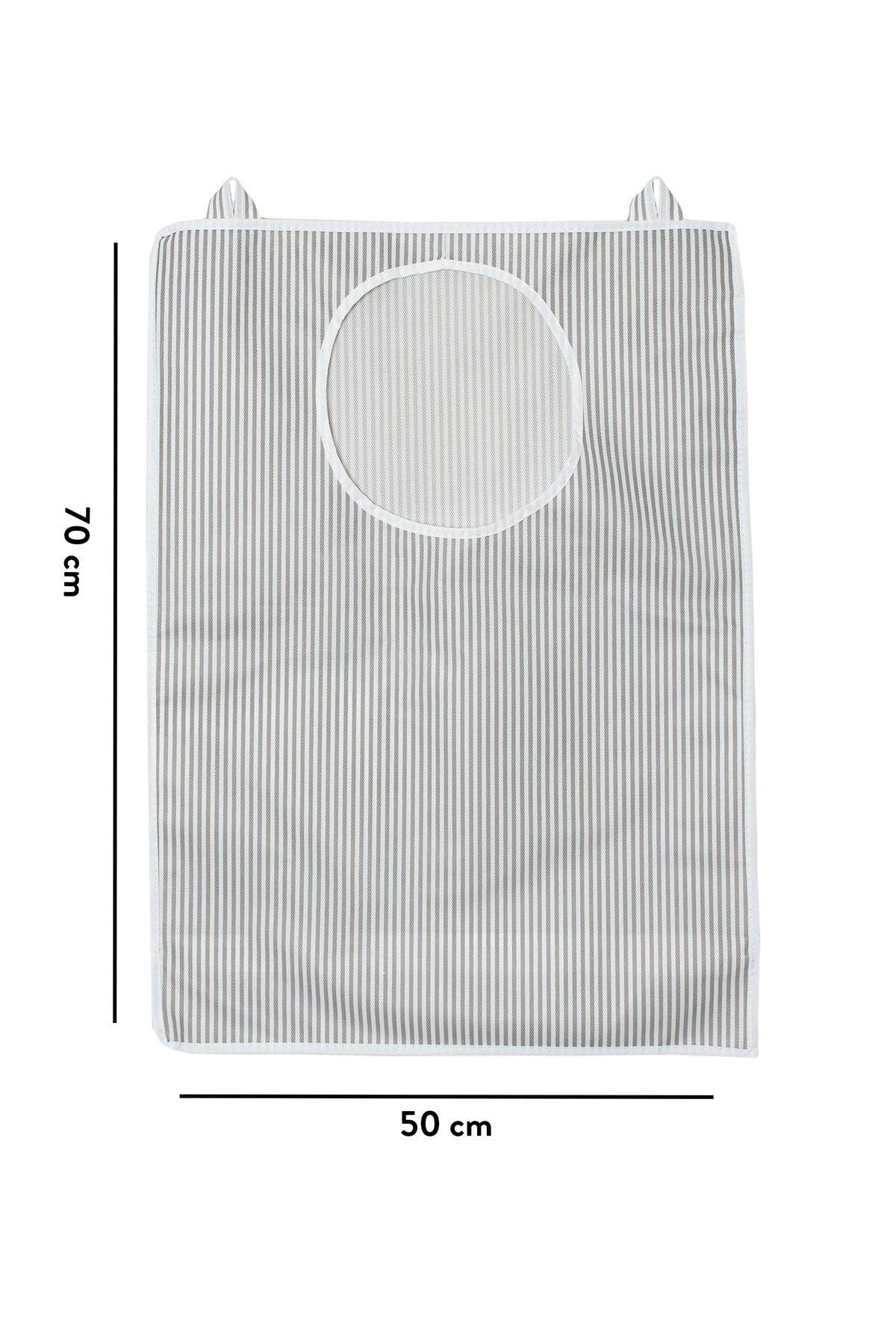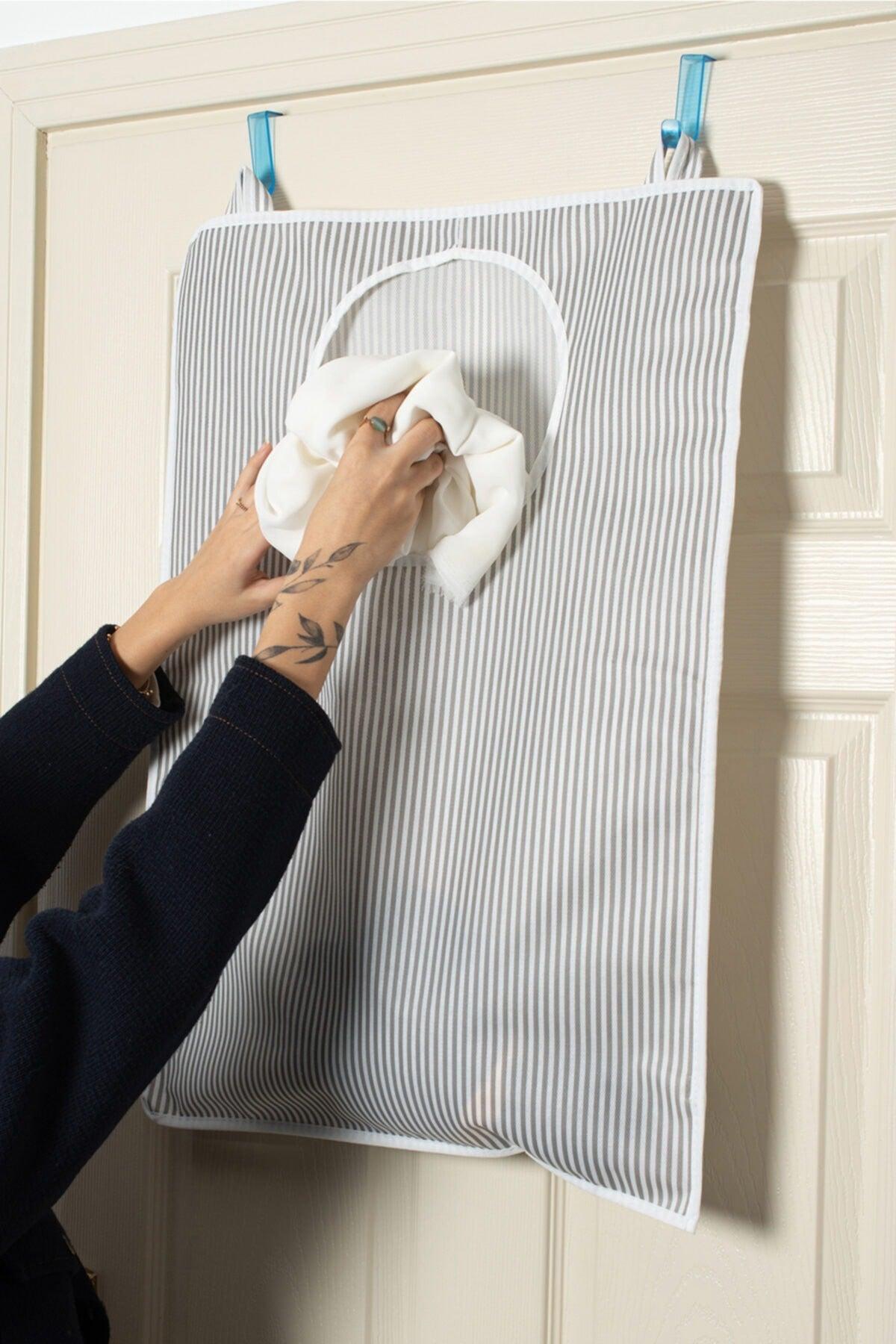 Hinter der Tür schmutziger Wäschekorb grau gestreift