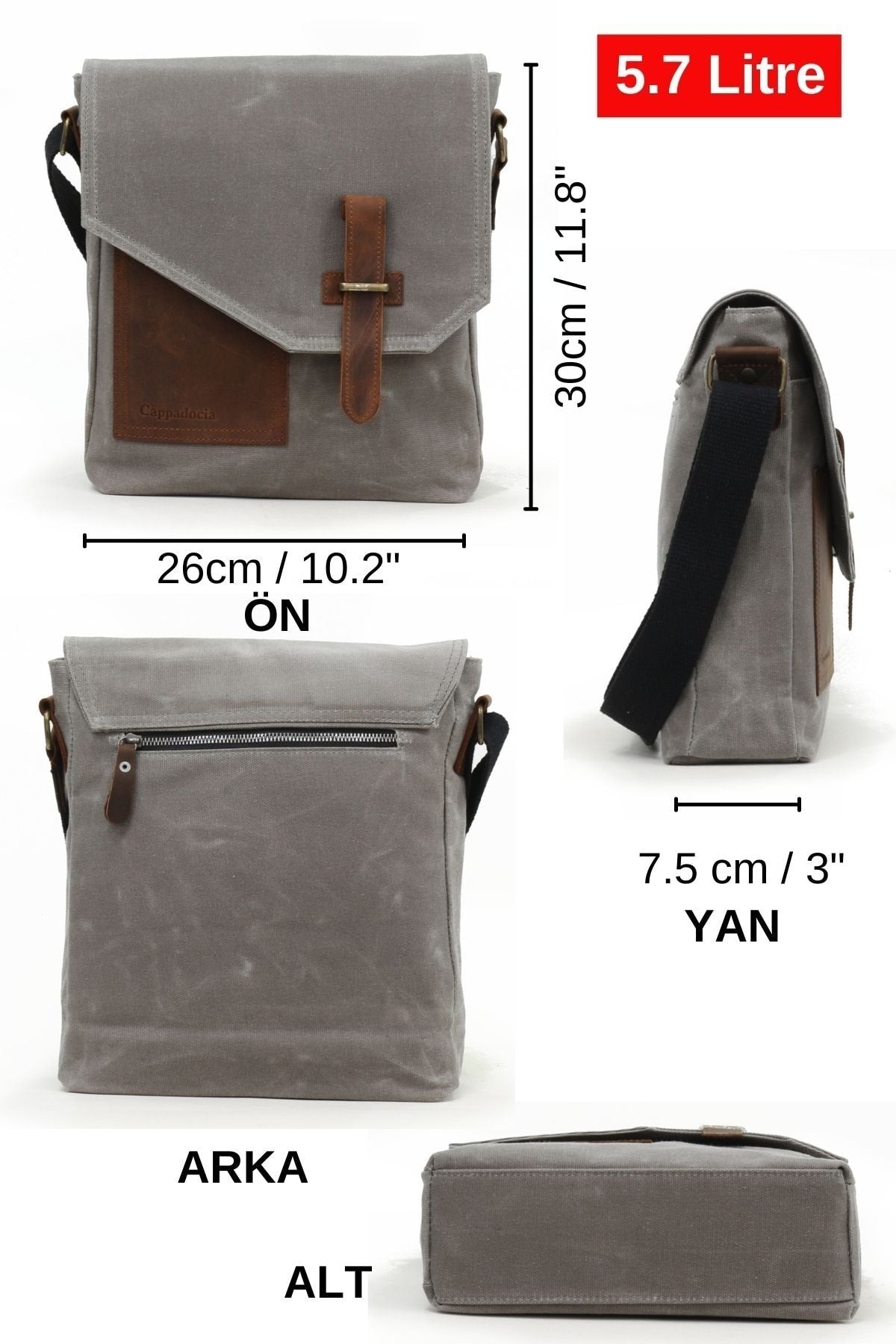 Cappadocia Echtleder 4035 Teos Wasserdichte Graue Postman Schultertasche aus gewachstem Canvas