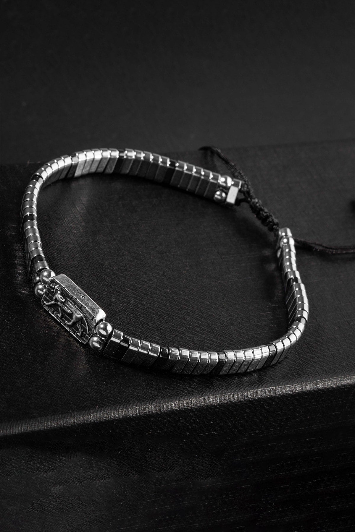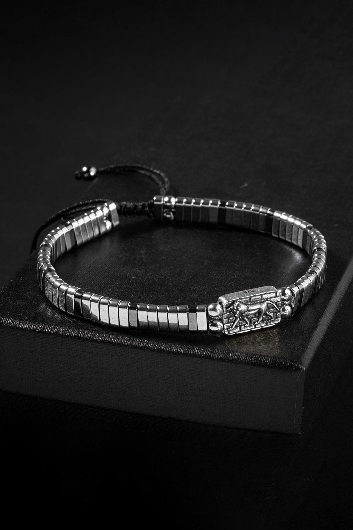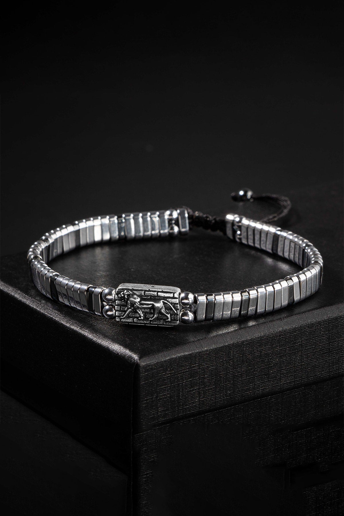 Gestricktes Armband aus zertifiziertem Hämatit-Naturstein, 925er Silber (Löwensymbol)
