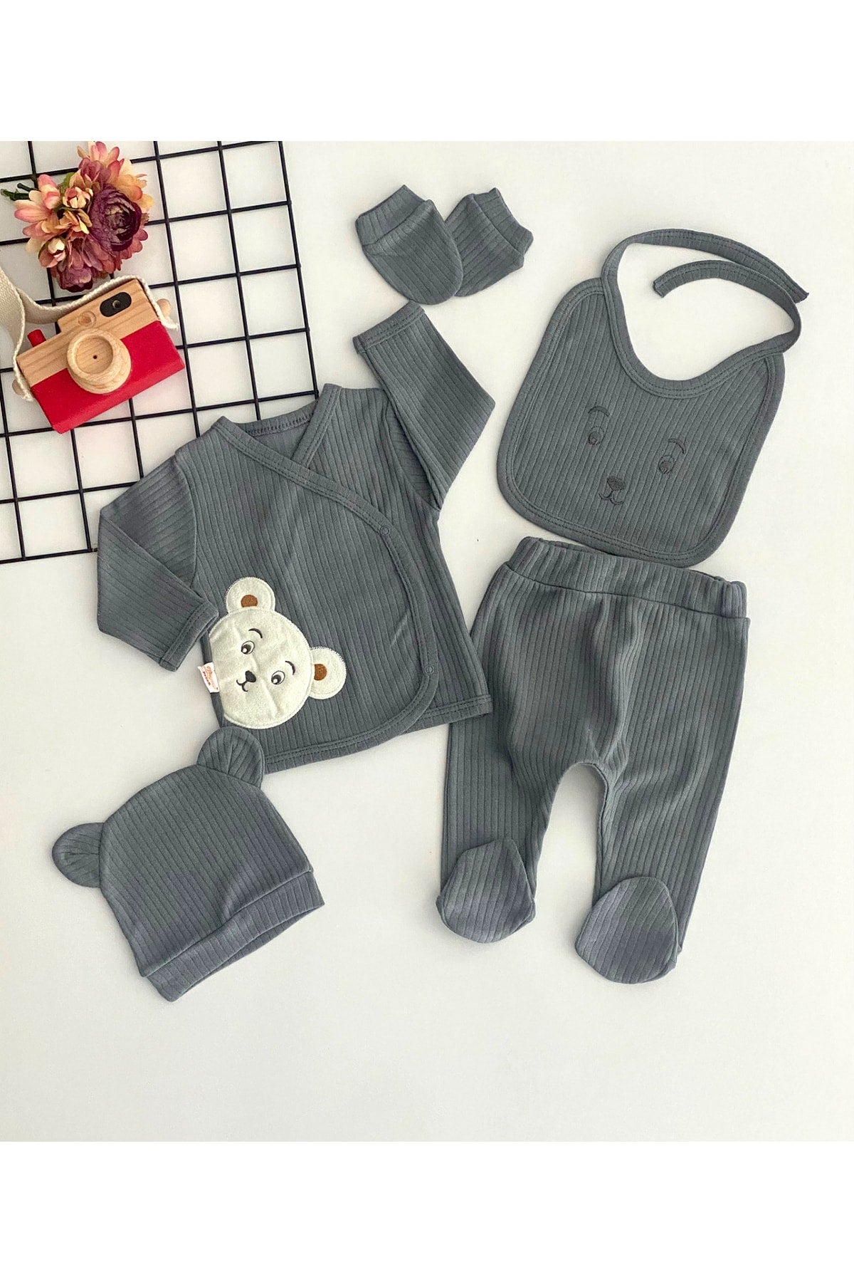 Cheerful Babies Bio-Stoff Teddybär bestickt Muster 5 Stück Krankenhaus Outlet Set grau