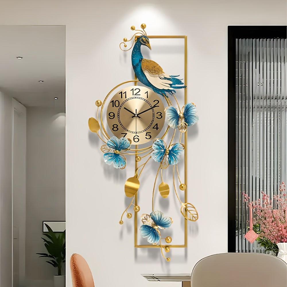 [Elegant Peacock Wall Clock] Luxury Elegant Peacock & Butterfly Metal Wall Clock | Silent Non-Ticking Design with Golden Accents, Blue & White Floral Patterns | Durable Indoor/Outdoor Decor for Living Room, Bedroom