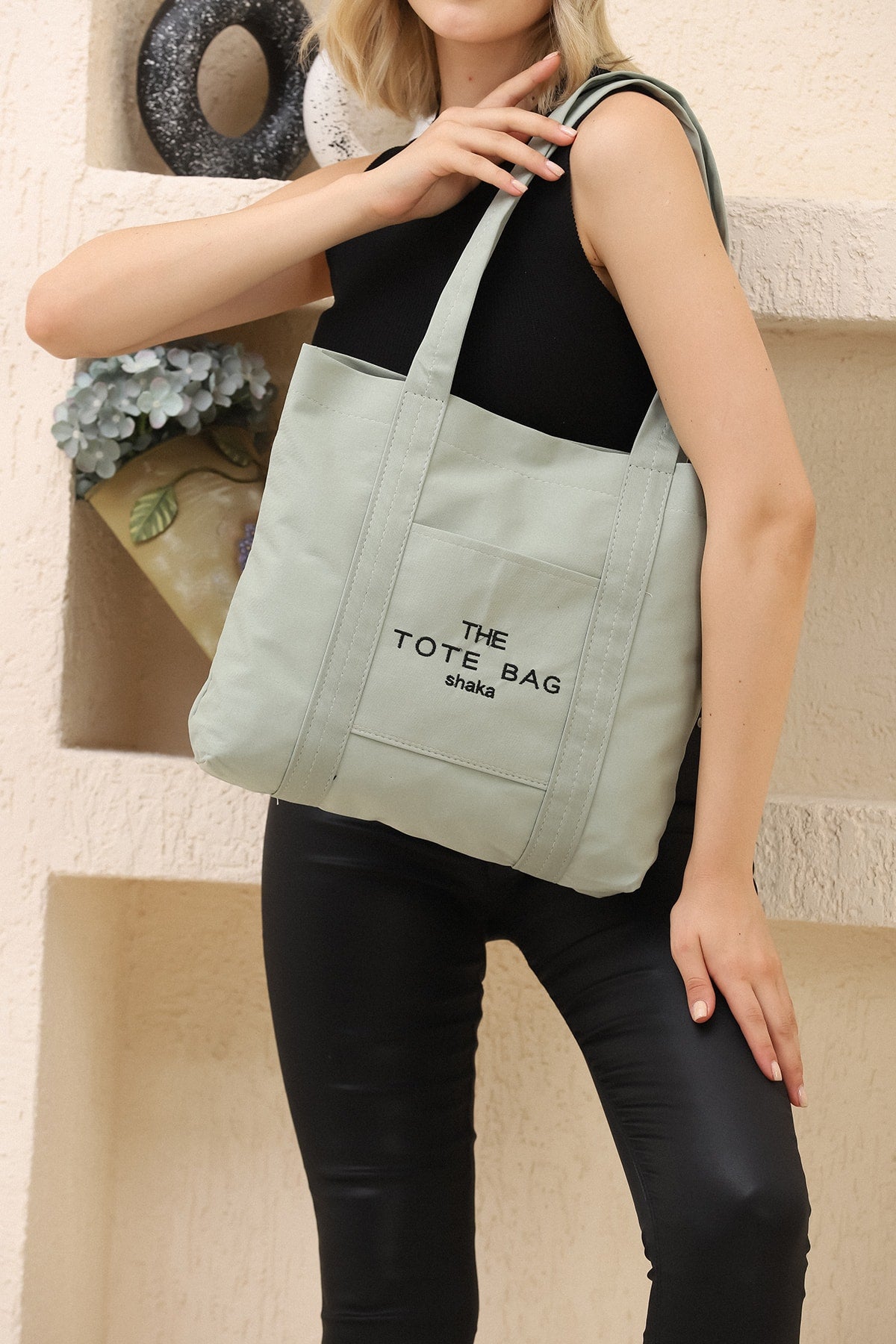 Grüne U46 Druckknopfverschluss Fronttasche Detaillierte Tragetasche Bestickte Canvas Damen Arm- und Schultertasche U:30 E