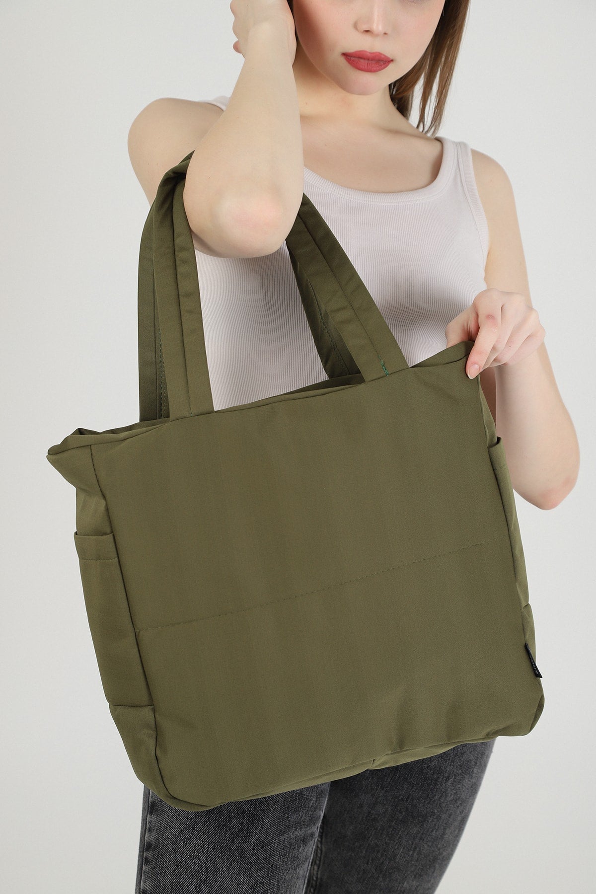 Khakigrüne U25 Arm- und Schultertasche für Damen aus Canvas mit 3 seitlichen Fächern und 2 Taschen, detaillierter Reißverschluss, B:35 E