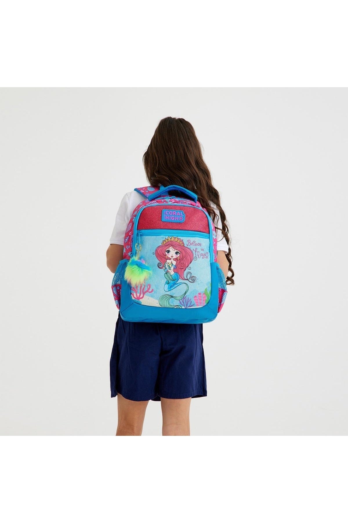 Kinder-Schulrucksack mit drei Fächern, blau/rosa, Meerjungfrauen-Muster, 23476