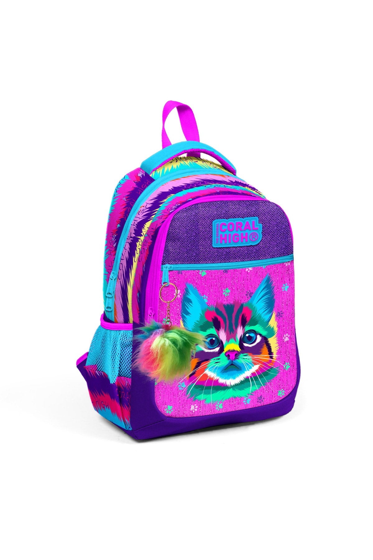 Kinder-Schulrucksack mit drei Fächern, lila/rosa, Katzenmuster, 23477
