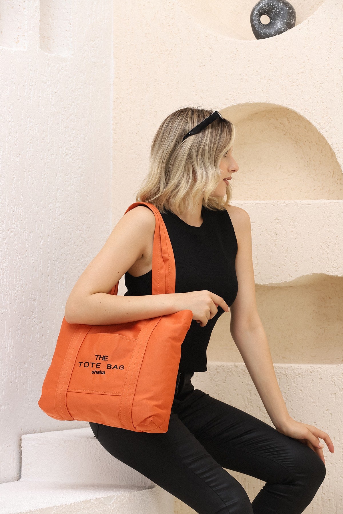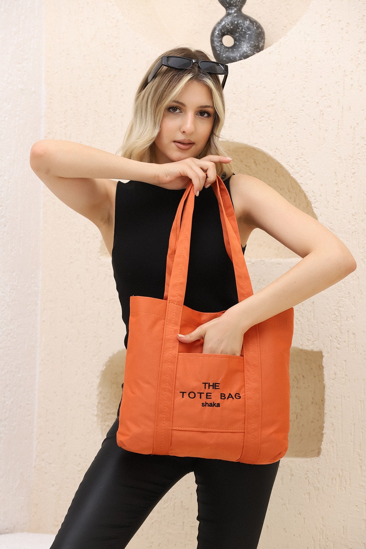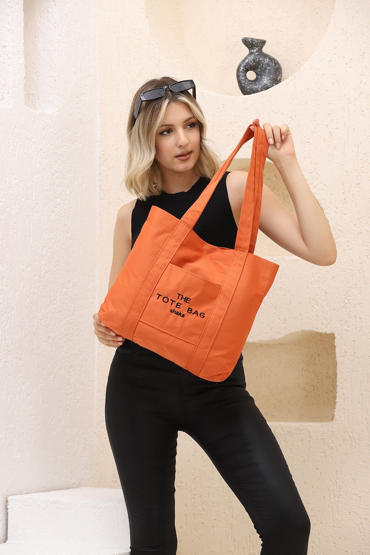 Orange U46 Druckknopfverschluss Fronttasche Detaillierte Tragetasche Bestickte Canvas Damen Arm- und Schultertasche U:30