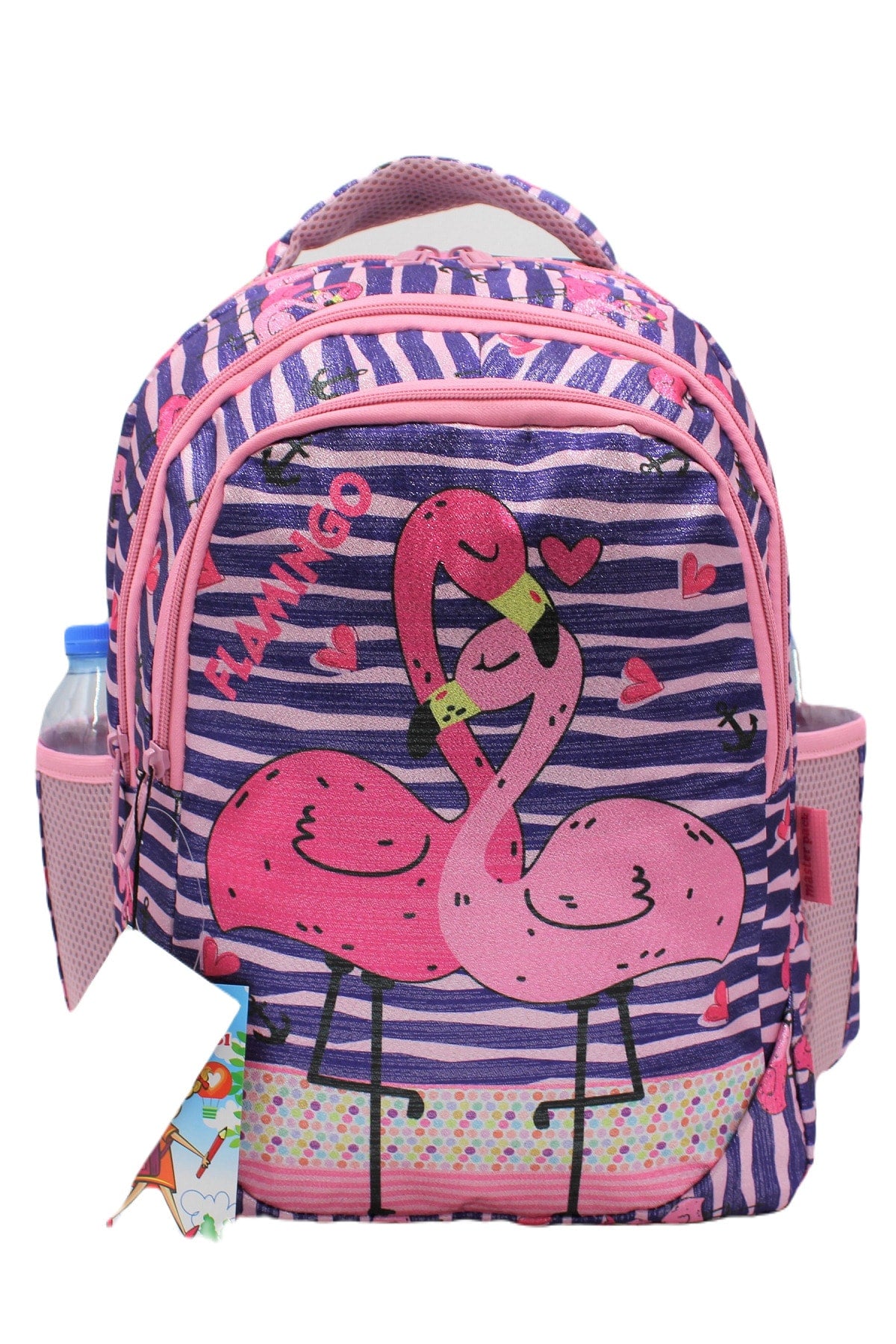 Sim Flamingo gemusterter dunkelvioletter Rucksack für Mädchen, Grundschultasche, Set mit Lunchbox und Stifthalter