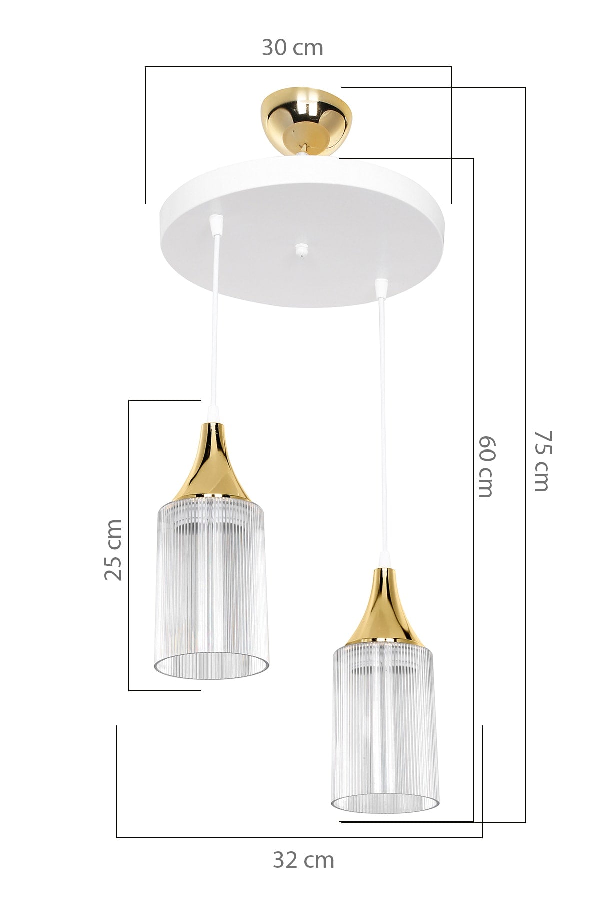 Höhe ab Decke: 75 cm Tablett (Plafonier) + Gehäuse (Arme) Länge: 60 cm Tablett (Plafonier) Durchmesser: 30 cm Beschichtungszubehör + Gehäuse (Glas) Länge: 25 cm Breite: 32 cm. Die Glühbirne ist nicht in unserem Produkt enthalten. . Lampenfassungstyp: Geeignet für die Verwendung mit 2 * E27 max. 20 W Energiesparlampen oder LED-Glühbirnen. . Die zweiteilige dekorative Pendelleuchte „Aksel“, gestaltet mit der Kombination aus optischem Glas, kupfer-/goldfarbenem Lampenfassungszubehör mit Tulpenform und rundem Gehäuse aus ABS-Material, verleiht der Umgebung ein anderes Ambiente. . Die verwendete Installation wurde aus Material (100 % Kupferleiter) hergestellt, das den TSE-Standards entspricht. . Sie sorgt für eine homogene und ästhetische Beleuchtung der Umgebung. . Dank des Aufhängungssystems kann die Höhe an Ihre Decke angepasst werden. . Das Produkt kann leicht mit einem feuchten Tuch gereinigt werden. Eigenschaften des optischen Armglases: . das design, das durch die anpassung geometrischer winkel an langen dekorativen streifen mit hochtransparentem erscheinungsbild aus san-material aus der gruppe der technischen kunststoffe und die kombination von lichtbrechung und -reflexionen in verschiedenen linienmusterprofilen entsteht, sorgt für eine moderne lichtatmosphäre. . dank der optischen rippen, die eine lichtbrechung in verschiedenen winkeln ermöglichen, entsteht ein deutlich stärkerer lichtstrahl, der den eindruck vermittelt, als würden zwei glühbirnen an derselben stelle brennen und nicht nur eine. . da die homogene verteilung des farbstoffs, der dem produkt seine farbe verleiht, im rohmaterial bereits während der produktionsphase sichergestellt wird, kommt es während der nutzung zu keiner farbveränderung des produkts durch äußere einflüsse. . die verschiedenen verfügbaren farbtypen (honig, rauchfarben, transparent usw.) verleihen den produkten, auf denen sie angewendet werden, eine unterschiedliche atmosphäre in ihrem eigenen stil. . die verwendete installation wurde aus material (100 % kupferleiter) hergestellt, das den tse-normen entspricht. . sie sorgt für eine homogene und ästhetische beleuchtung der umgebung. . Dank der Aufhängung lässt sich die Höhe an Ihre Decke anpassen. Das Produkt lässt sich leicht mit einem feuchten Tuch reinigen. Schaffen Sie mit dieser farbenfrohen LED-Beleuchtung eine partytaugliche Atmosphäre. Einfach zu installieren und perfekt für Veranstaltungen oder als Heimdekoration.