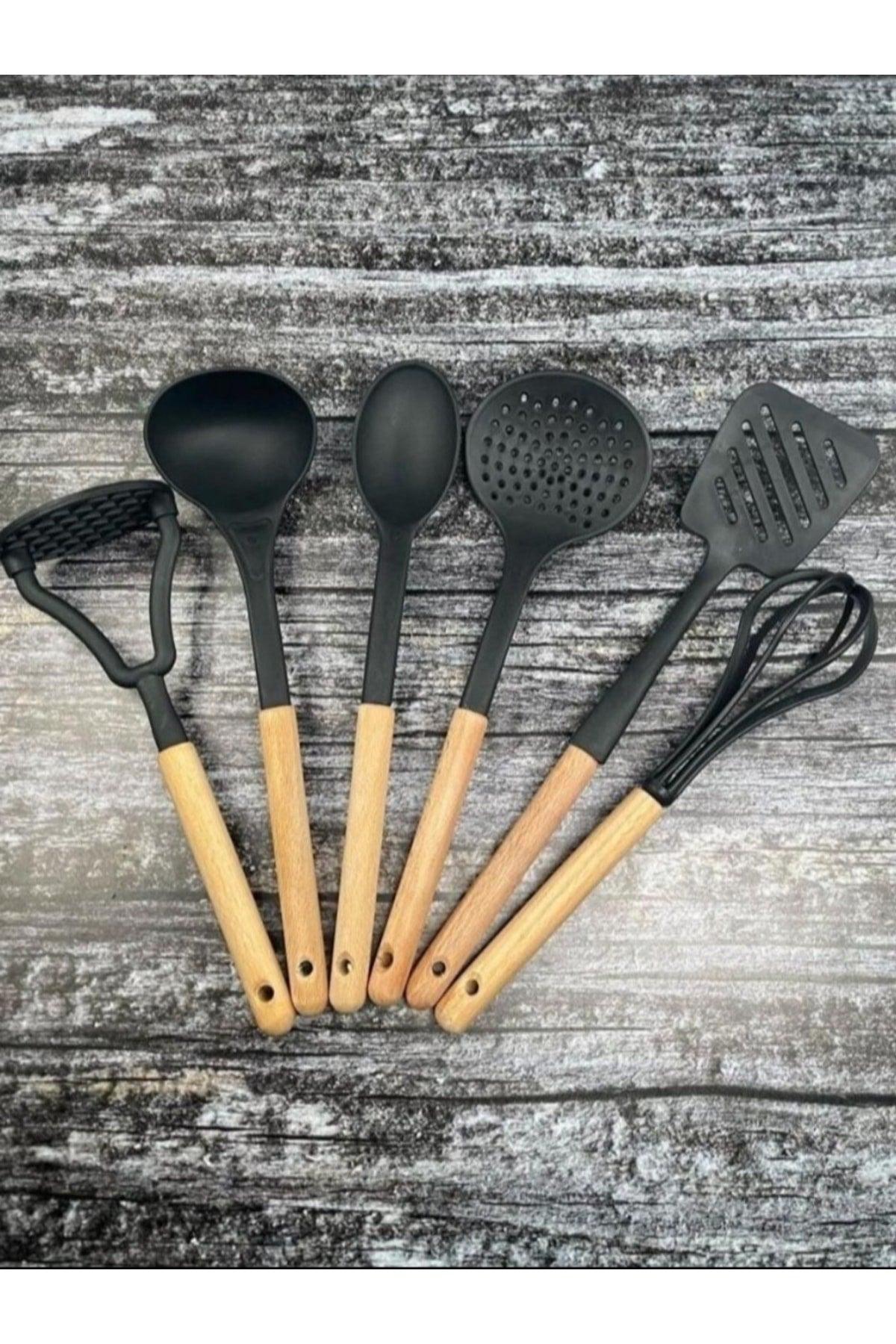 6 Practical Serving Set Non-Scratch Heat-Resistant Wooden Handle Spoon, ladle, spatula, whisk, colander, crusher - Swordslife