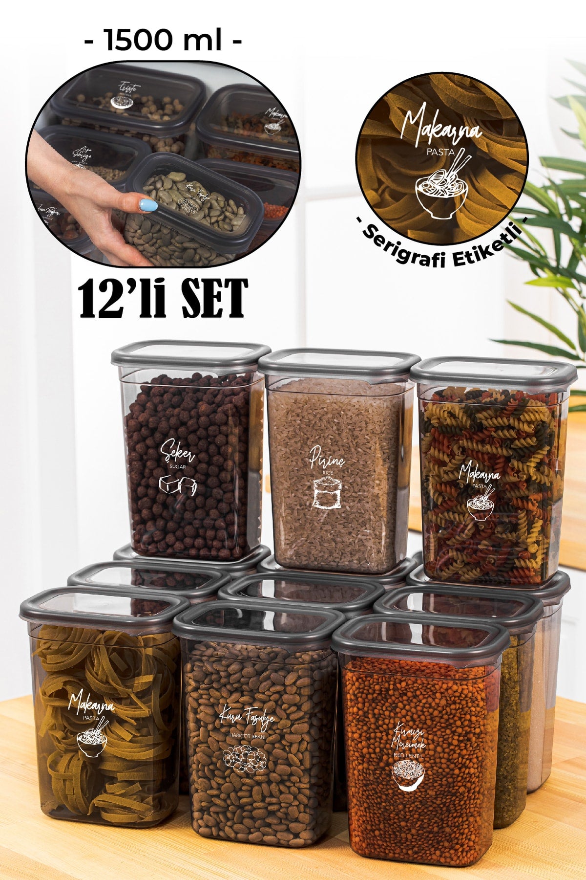 12 Peggy Rectangular Storage Container Set With White Screen Printing Label 1500 Ml Anthracite