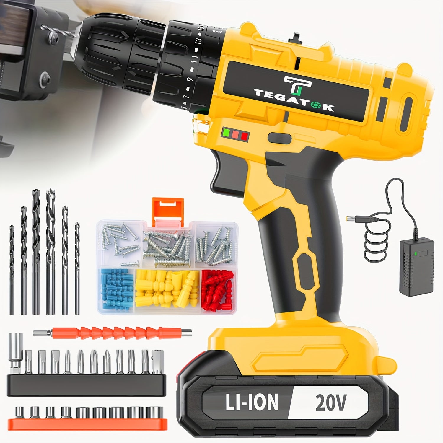 20V Cordless Drill Set, Impact Power Drill with 3/8 Inch Keyless Chuck, 18+3 Clutch Electric Drill with Work Light, Max Torque 45Nm, 2-Variable Speed & 2.0AH Batteries And Fast Charger, Bits Set And Box for, Home Repair, Gift for Men