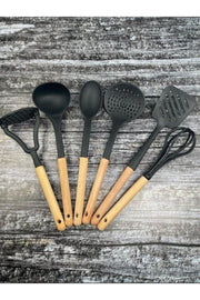 6 Practical Serving Set Non-Scratch Heat-Resistant Wooden Handle Spoon, Ladle, Spatula, Whisk, Colander, Crusher