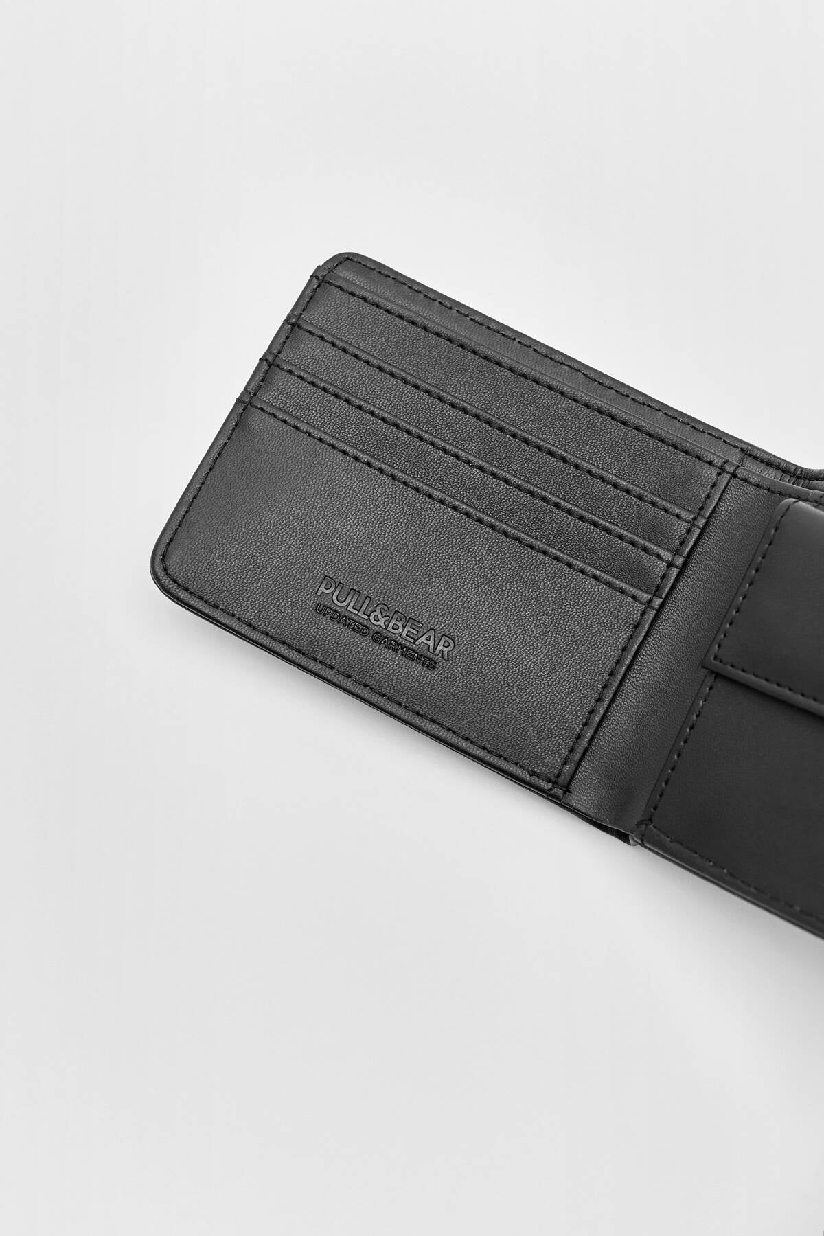 Black faux leather wallet with embossed logo.100% polyurethane cannot be dry clean - never washed - cannot be which is used - no iron - cannot be cleaned with roller Improved version for clearer understanding and better search visibility. Suitable for users seeking detailed and reliable product information.