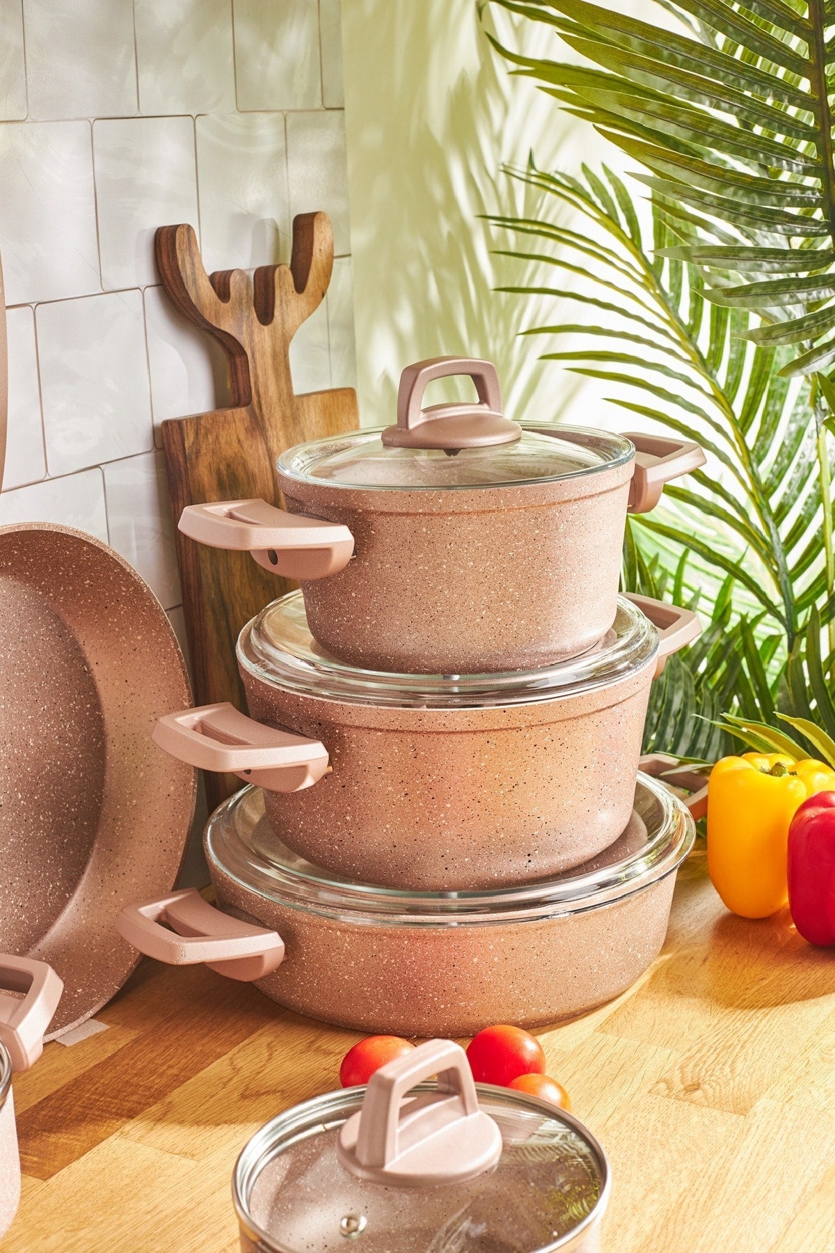 Karaca biogranit rosegold 12 piece cookware set contents of the set 18 cm pot 2 liter 22 cm pot 3.5 liter26 cm low pot 3 liter26 cm pan14 cm pan2 pieces 14 cm pot+2 pieces lidmaterial: bio granite did you know? granite raw material produced in switzerland is sold to the whole world under the brand name karaca. why biogranite? it is healthy. it is an advanced technology product. the materials used in production are certified and do not contain any harmful substances. it is exceptionally resistant to scratches with its granite-like reinforced surface. Improved version for clearer understanding and better search visibility. Suitable for users seeking detailed and reliable product information.