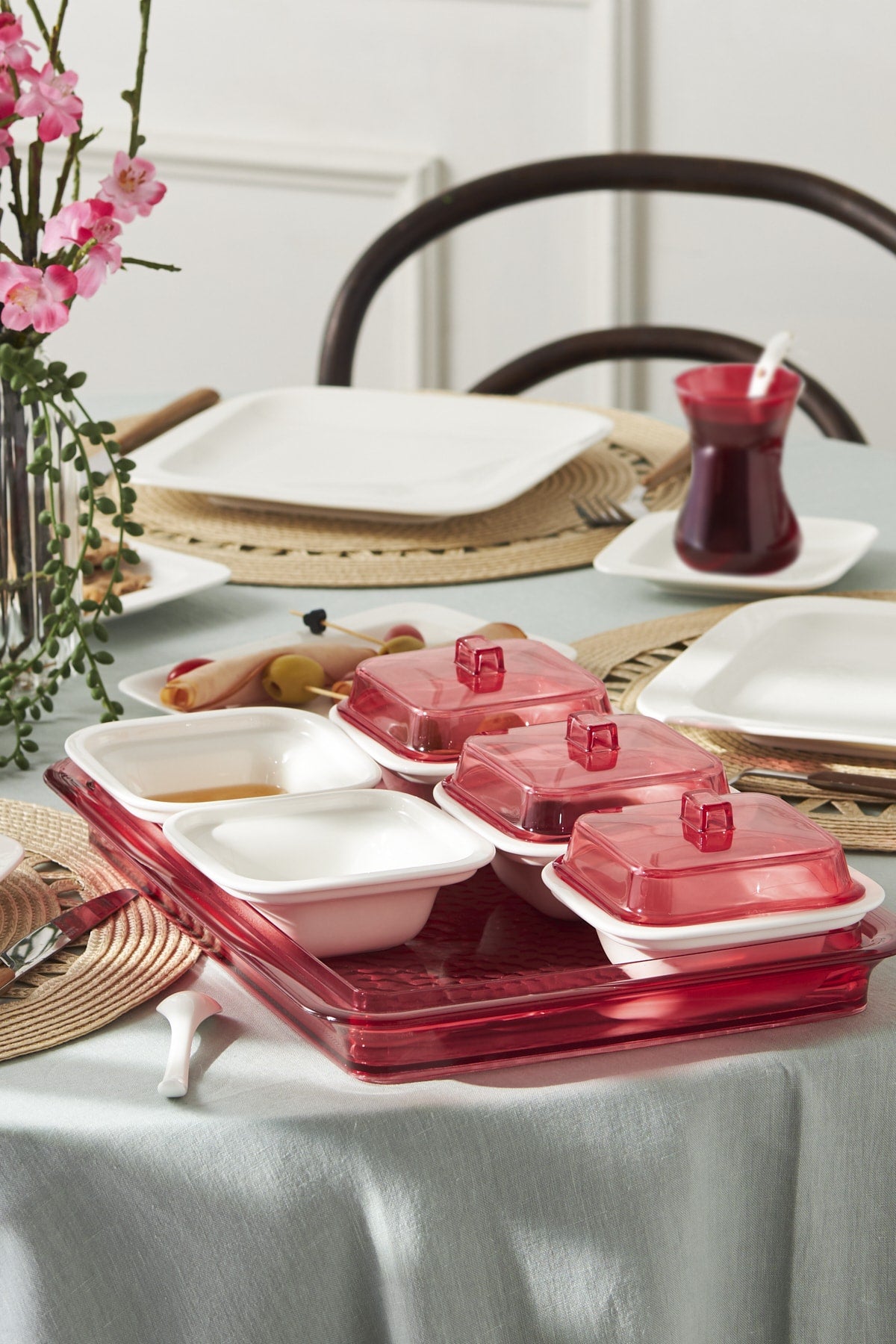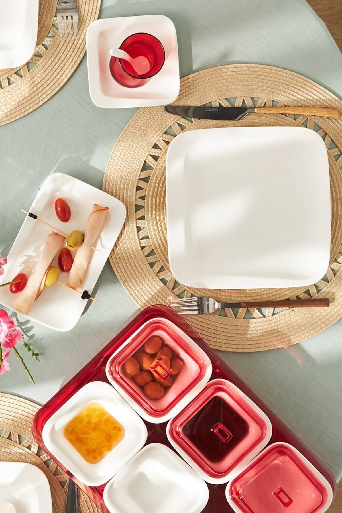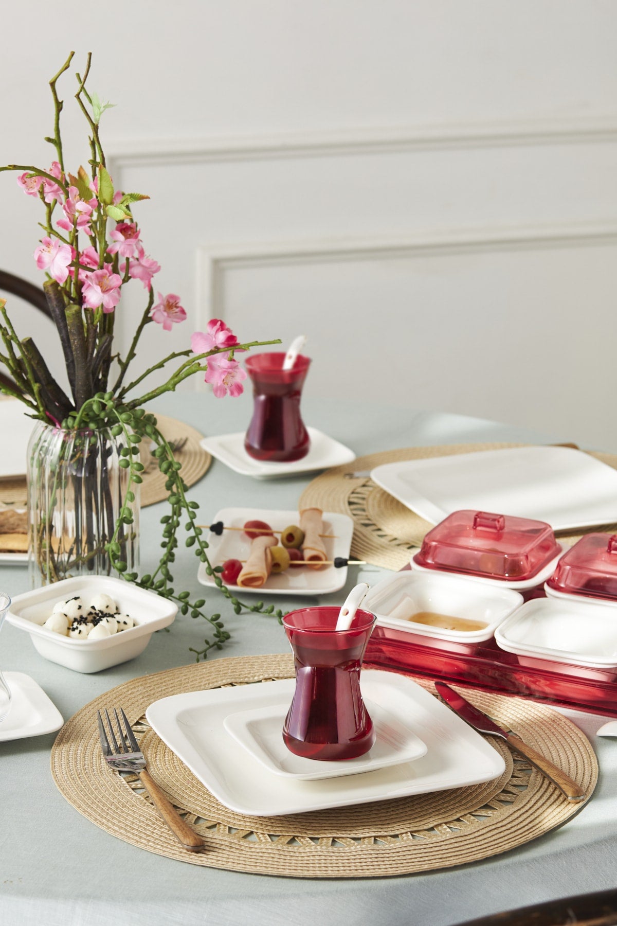 Karaca fabio red porcelain 41 pieces breakfast/service set for 6 persons square material: porcelain set contents 6 pieces serving plate6 pieces tea glasses6 pieces tea plates6 teaspoons6 pieces jam holder6 pieces acrylic jam lid2 pieces olive plate1 pieces acrylic tray1 pieces salt shaker1 pieces pepper shaker Improved version for clearer understanding and better search visibility. Suitable for users seeking detailed and reliable product information.