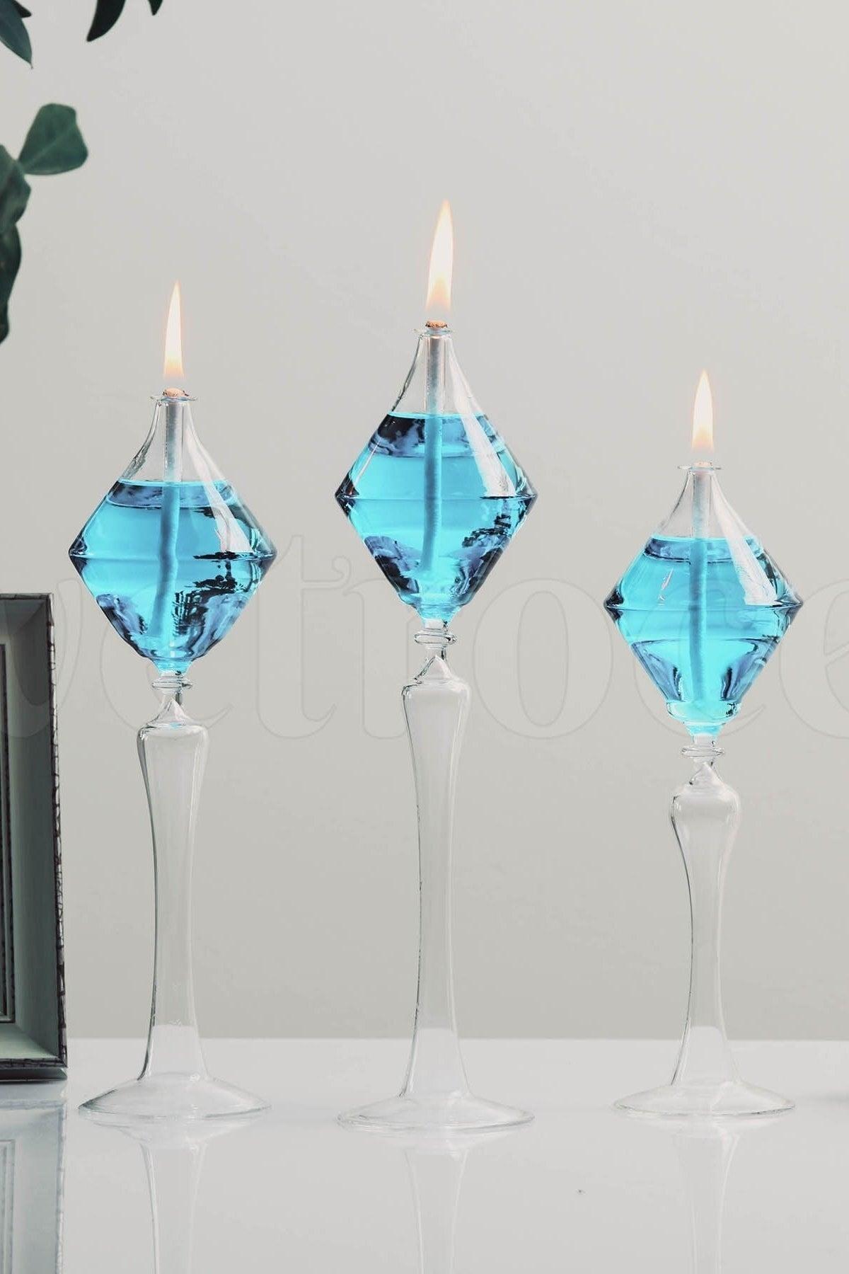 The product you bought is completely hand made blown glass and consists of triple glass oil lamps and 200 ml oil lamp. glass oil lamps, with their different models and elegant stance, will continue to be a part of your decoration and will continue to spread peace and joy with the fire of love. it is 24 - 27 - 30 cm long. candle oil is our gift. depending on 200ml fuel usage, average consumption is 35-55 days. when 200ml fuel is burned continuously, its life is 80-90 hours. the glass is transparent and the fuel in the glass lamps is colored. the glass lamps are handcrafted from heat-resistant glass. the glass wick is available in the package, ready to use. you can use the products continuously by filling them with oil lamp fuel. Elegant candle with rich fragrance and stylish design. Suitable for home decor, gifts, or creating a peaceful atmosphere.