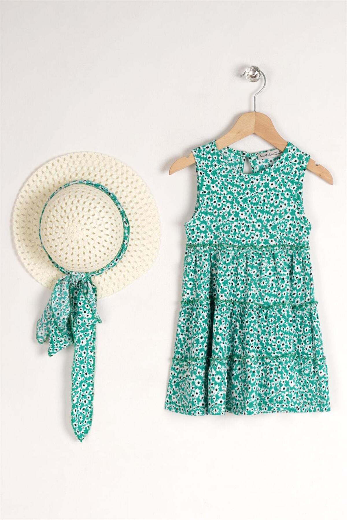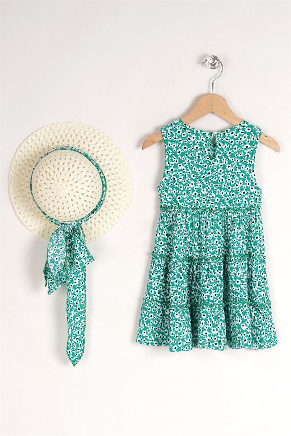 Girl Benetton Colorful Floral Patterned Dress With Hat Accessory