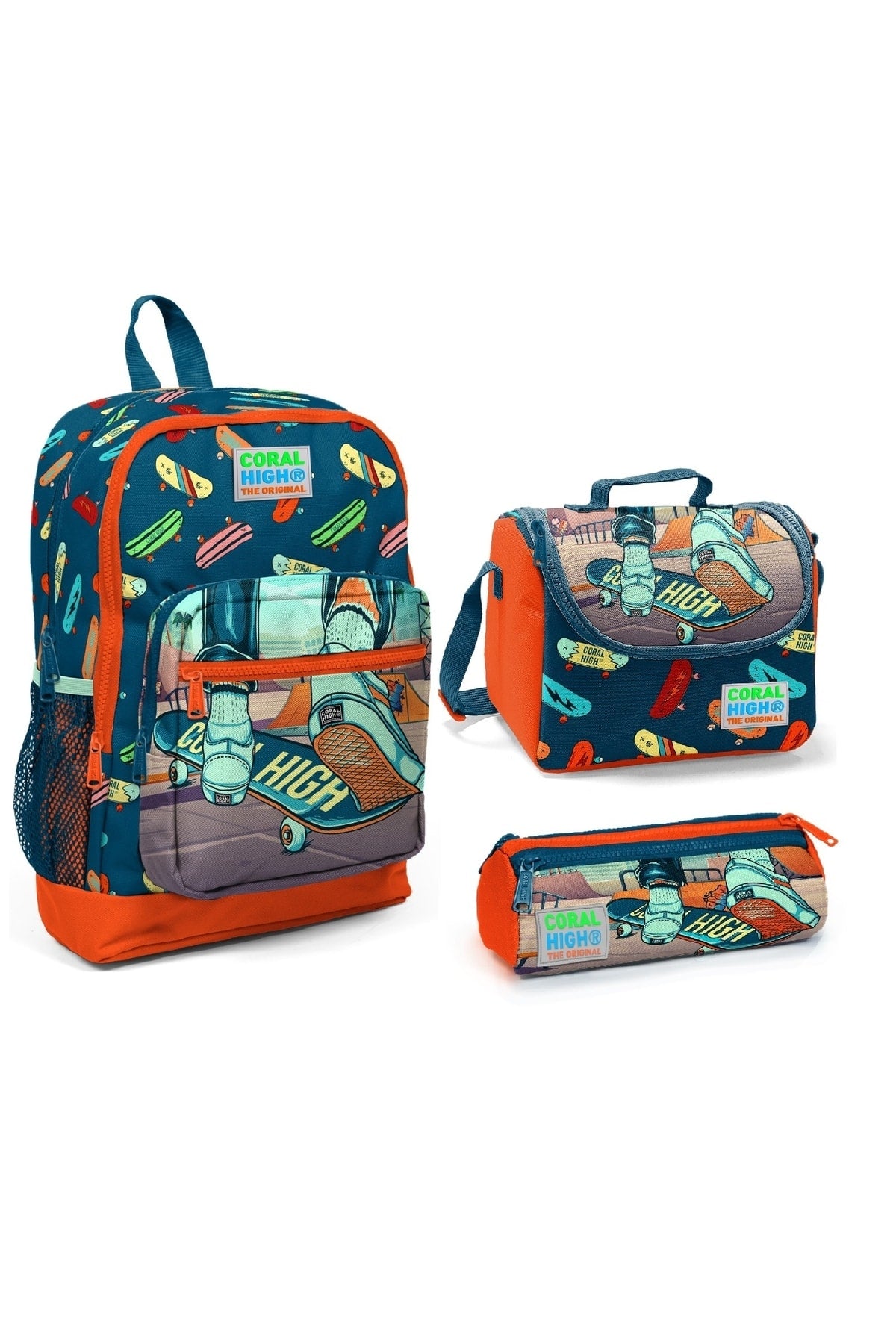 Kids Four Compartment Skateboard Patterned 3-Pack School Bag Set