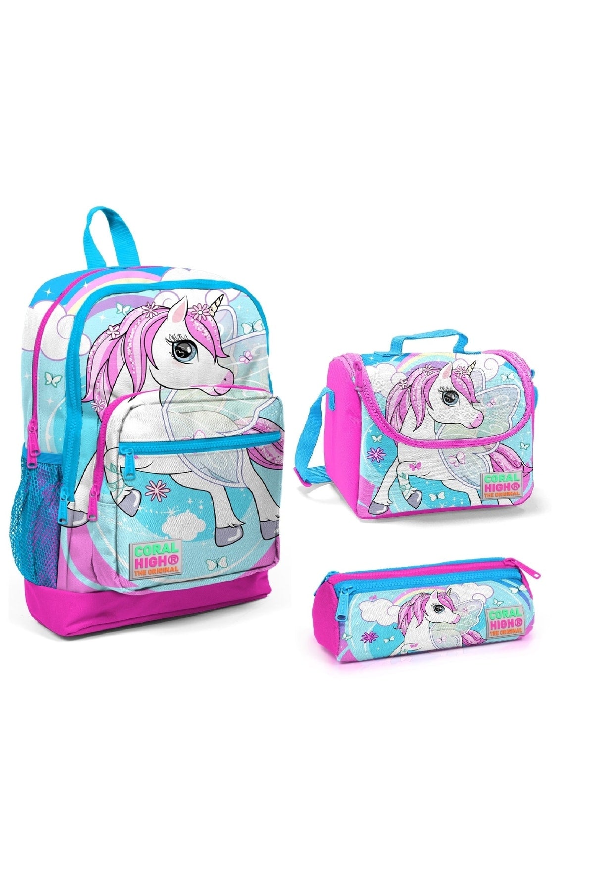 Kids Four Compartment Unicorn Turquoise 3 Pcs School Bag Set