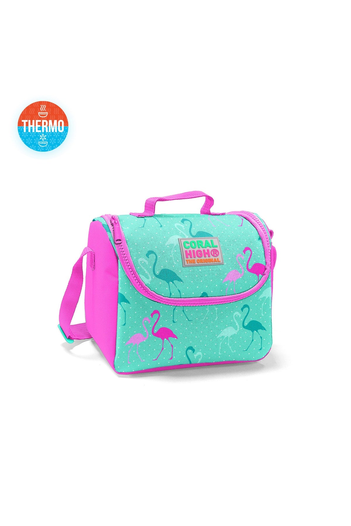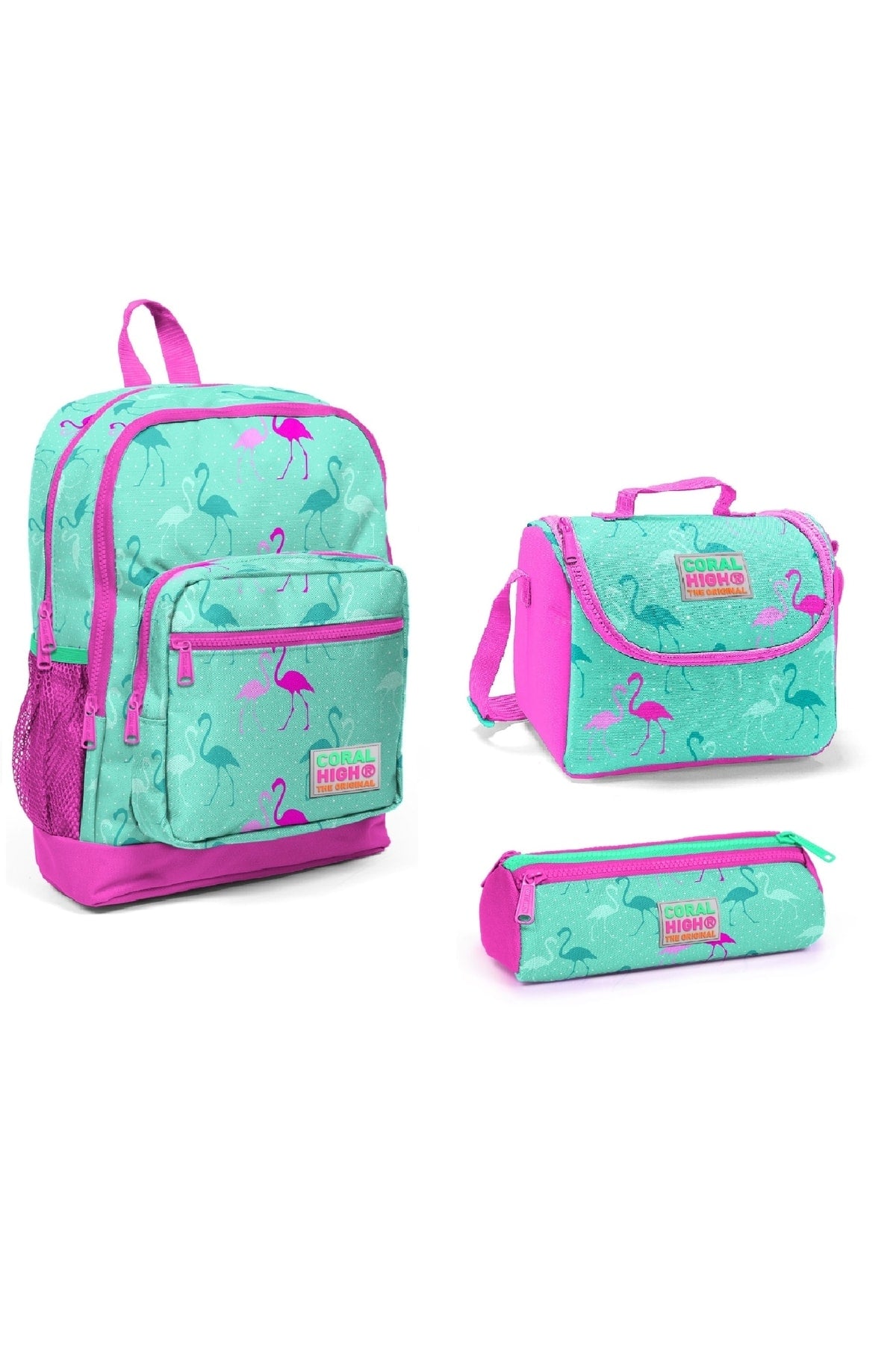Kids Four Compartment Water Green Flamingo Patterned 3-Piece School Bag Set