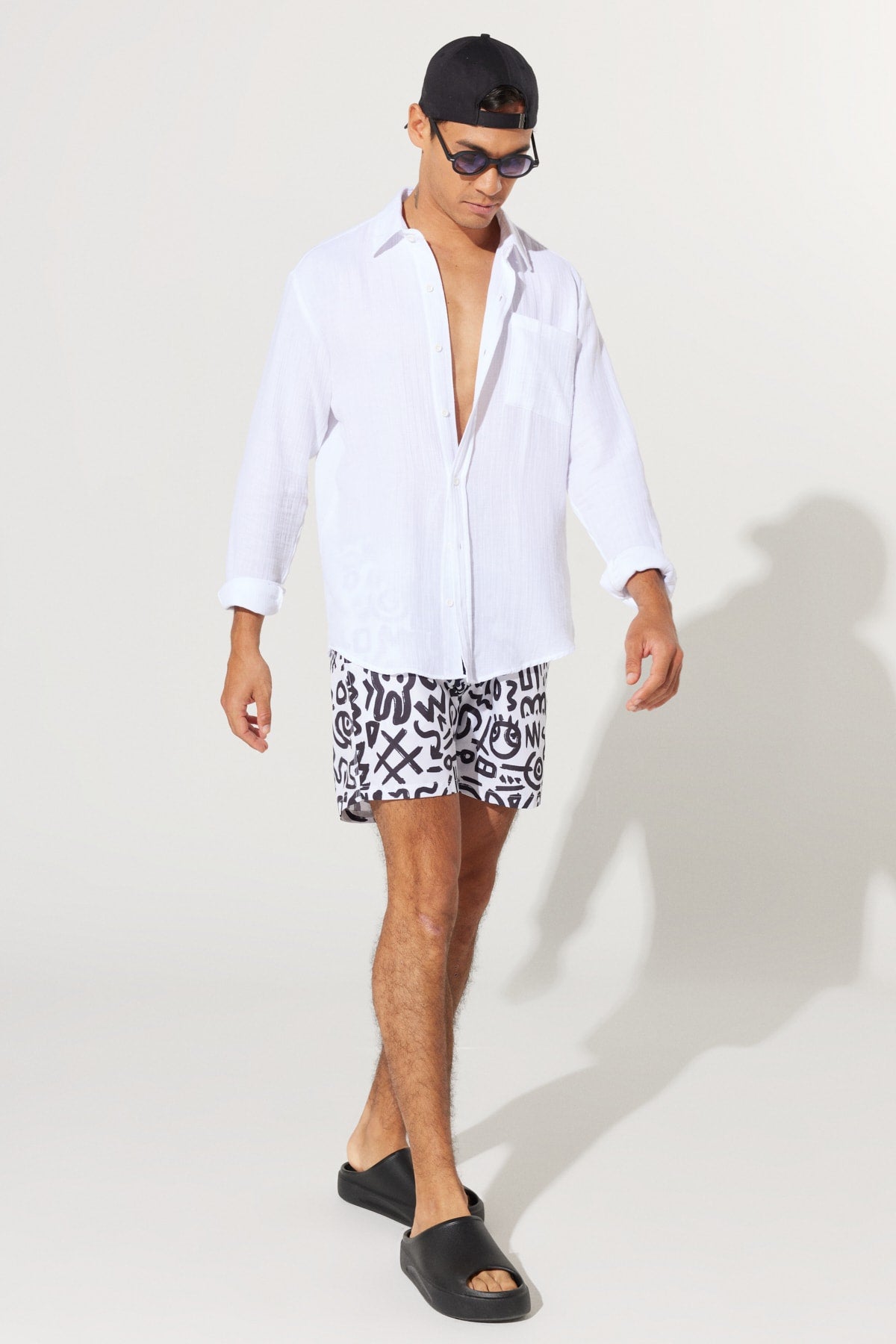 Men'S White-Black Standard Fit Regular Fit Side Pockets Patterned Swimwear Marine Shorts