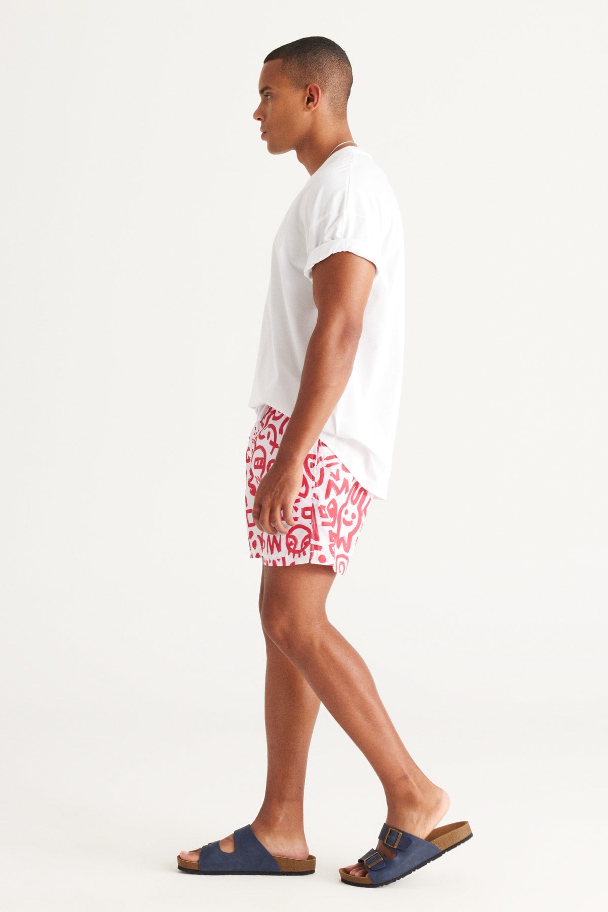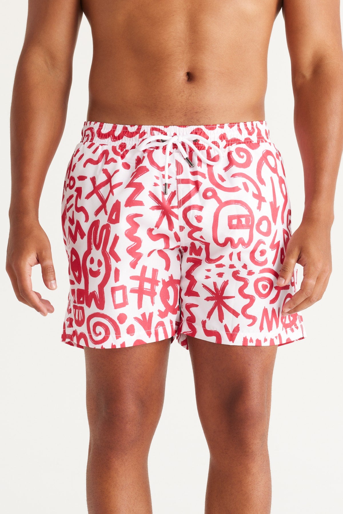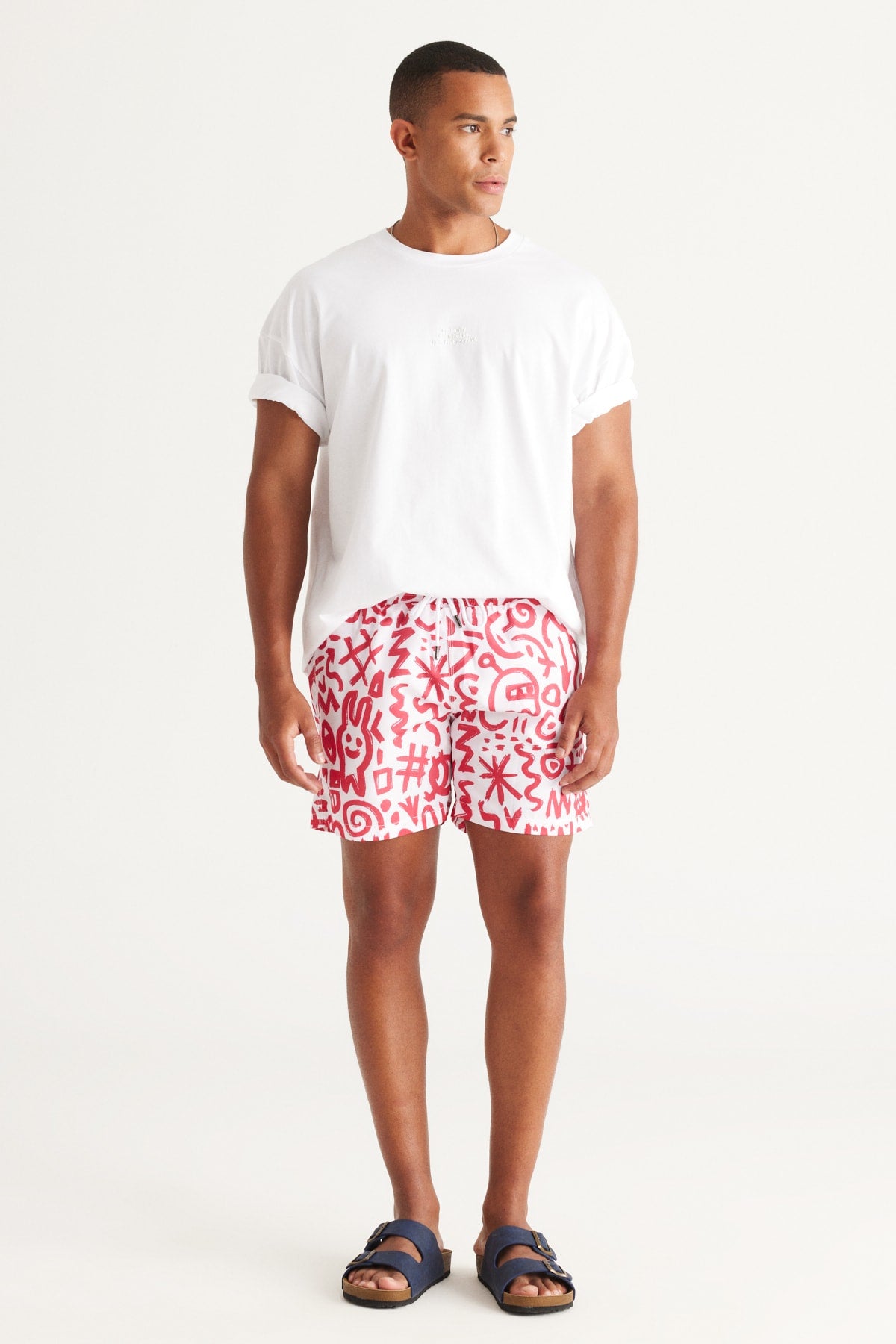 Men'S White Red Standard Fit Regular Fit Side Pockets Patterned Swimwear Marine Shorts