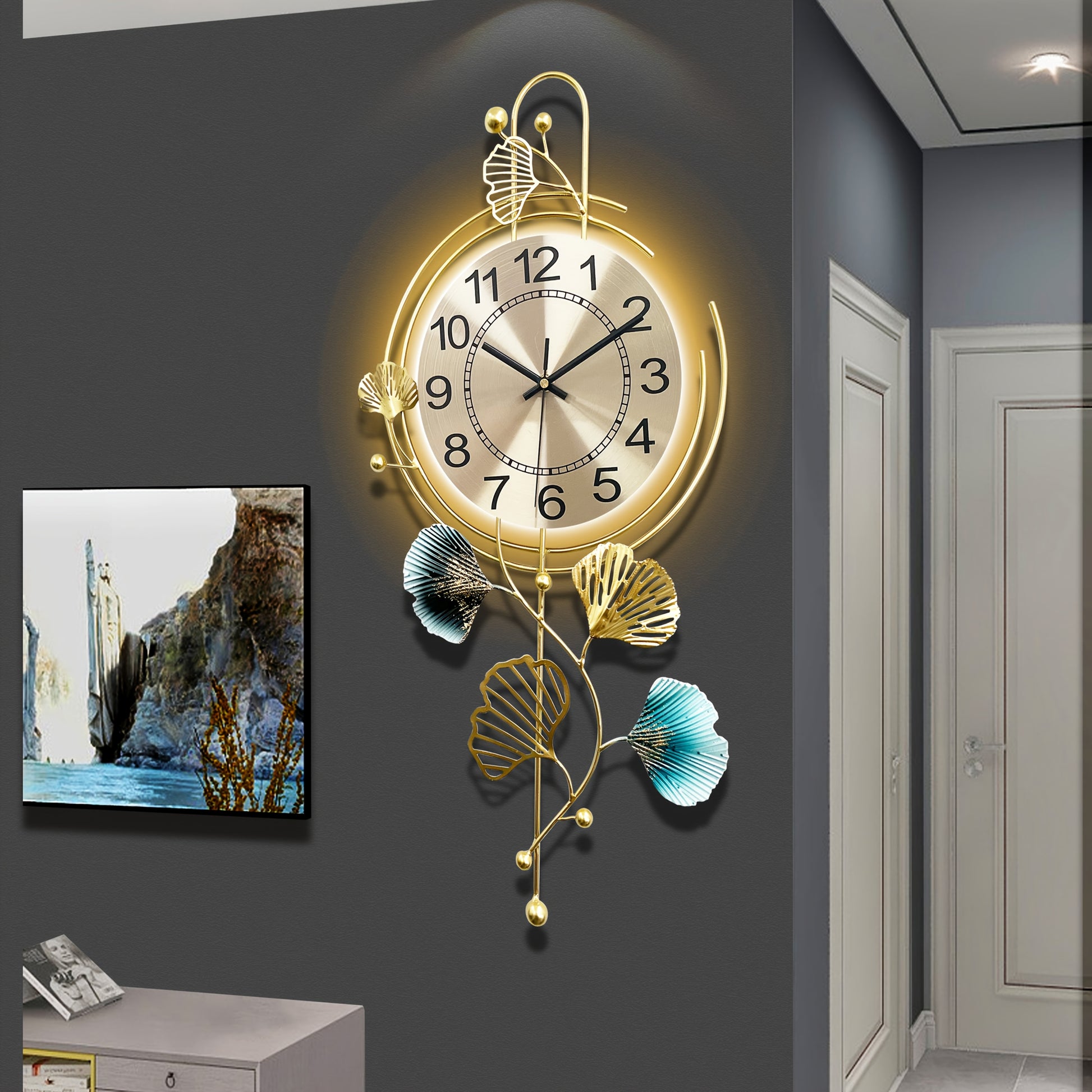 modern golden metal wall clock with led light 31x18 inches elegant ginkgo leaf design silent quartz movement living room bedroom kitchen or entryway decor wall clock living room