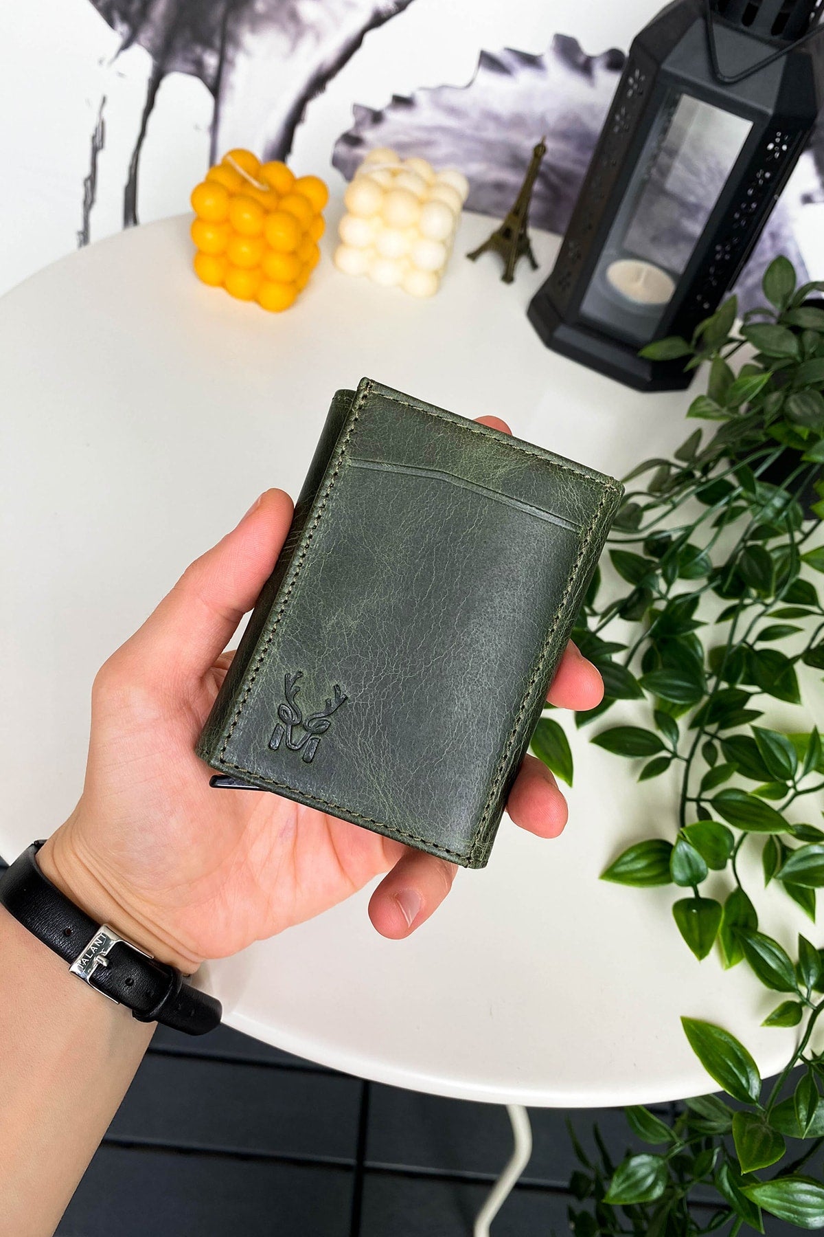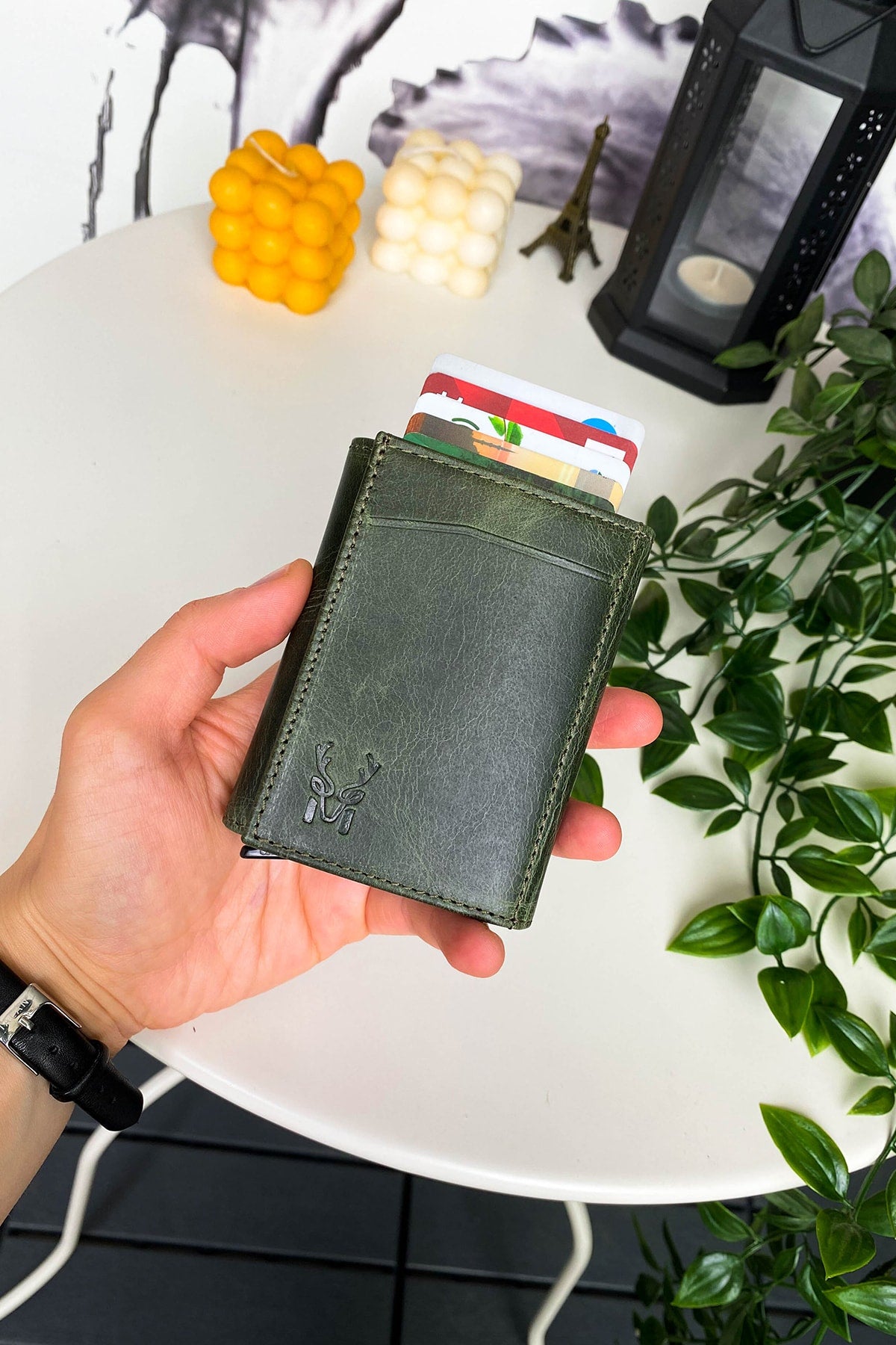 Pescol - Green Smart Card Holder / Wallet With Genuine Leather Rfid Protected Mechanism, Top Level Craftsmanship