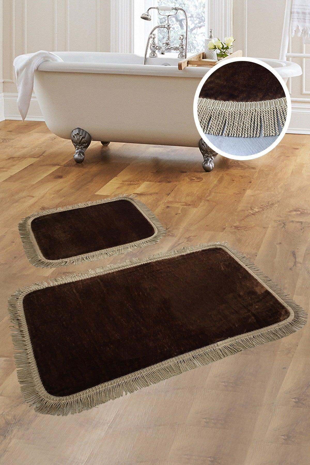 Shareton Cornered Brown 2-Piece Bath Mat Set Twirl Fringed Tassel Closet Set