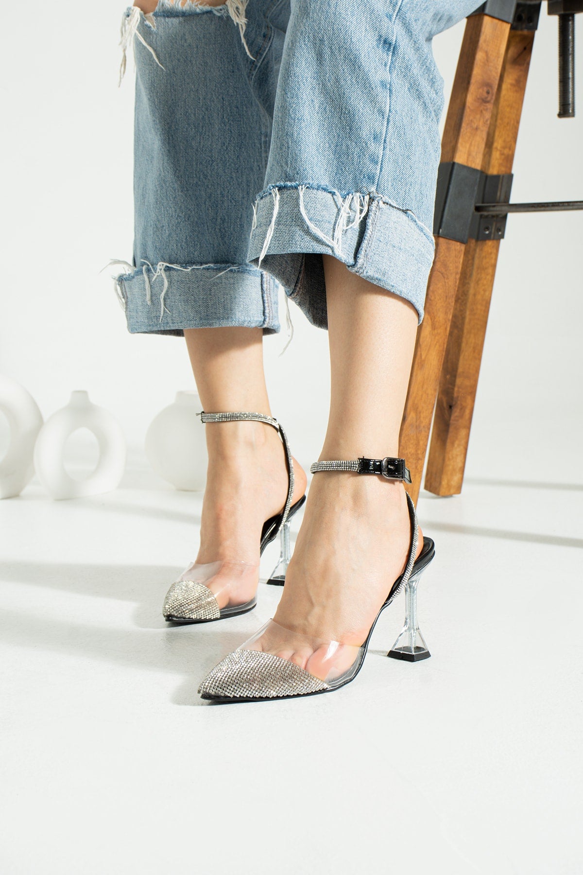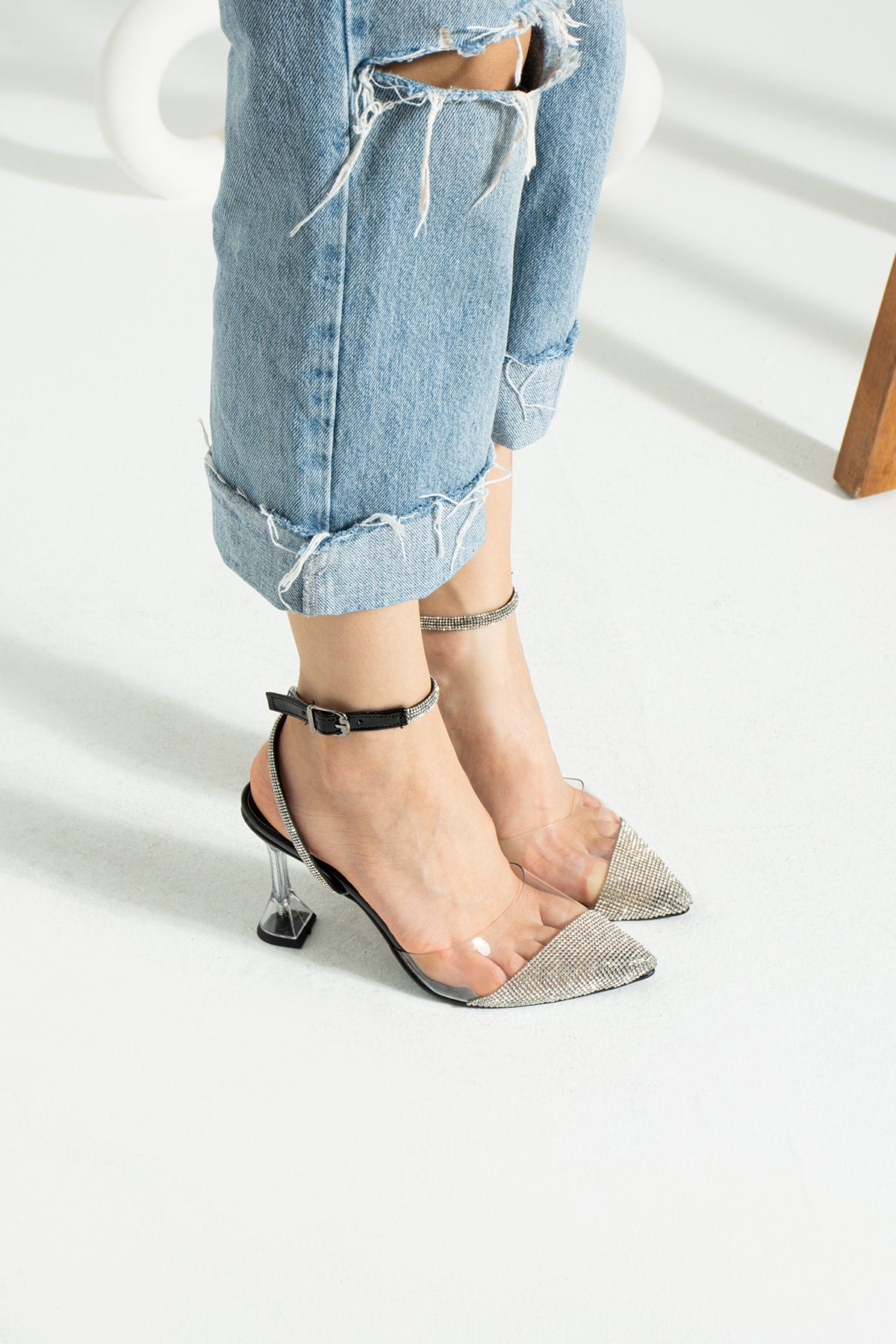 Black Transparent Stone Women'S Evening Dress Heeled Shoes