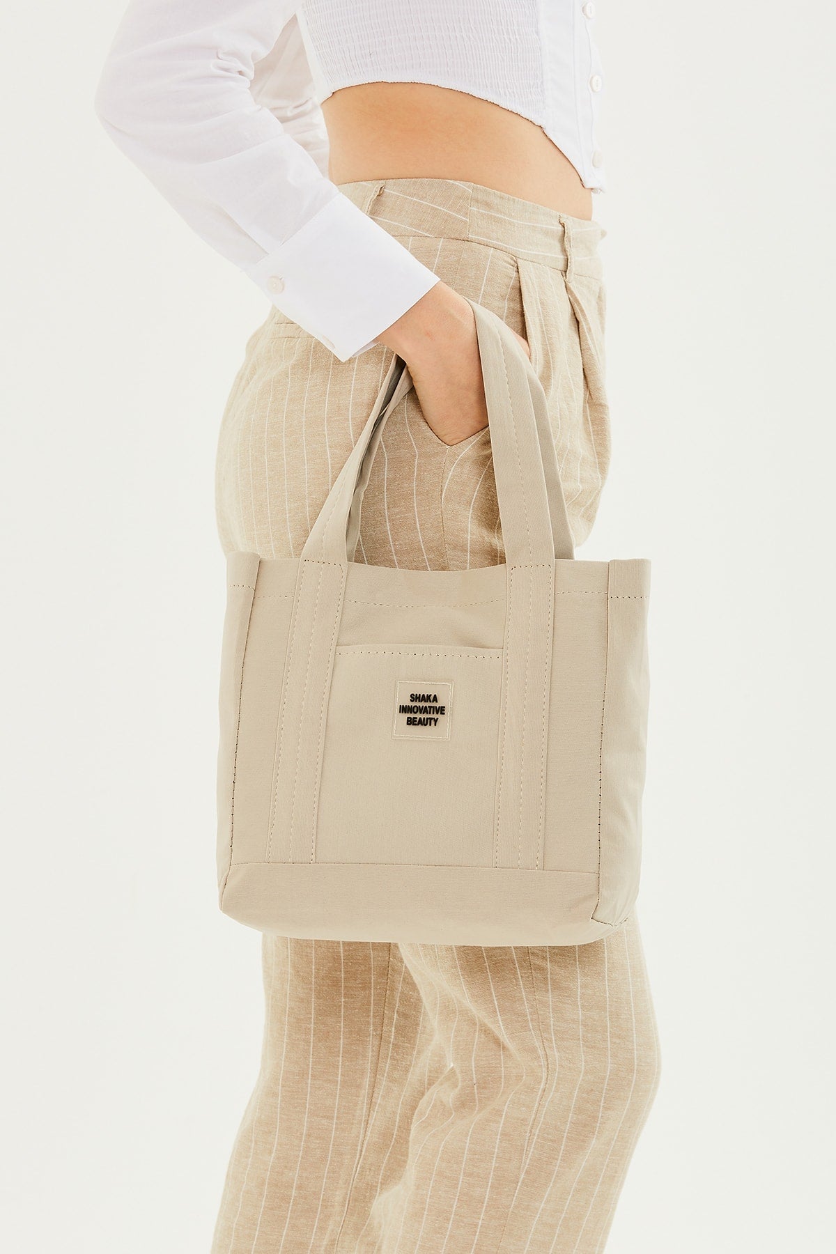 Cream U37 Snap Closure 2 Compartment Front Pocket Detailed Canvas Fabric Daily Women'S Arm And Shoulder Bag U: