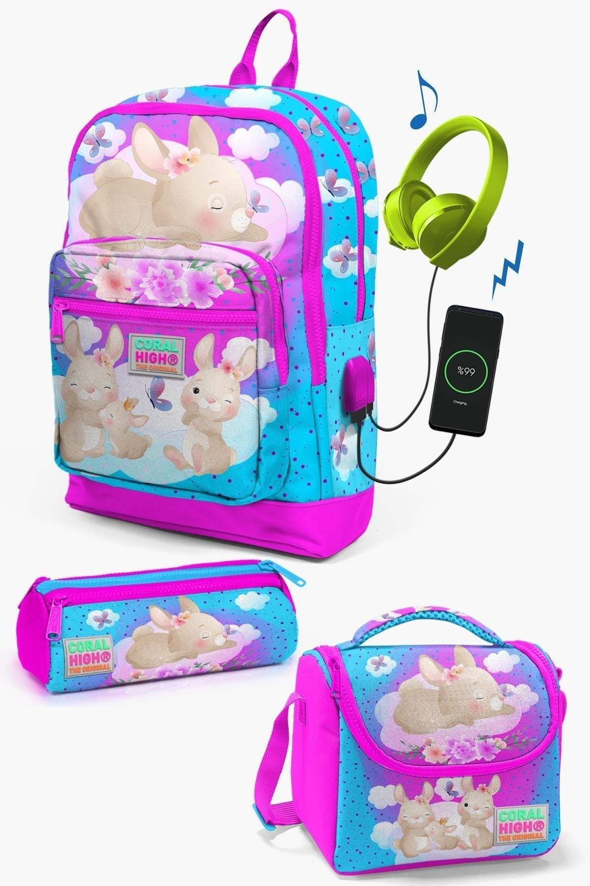 Kids Blue Pink Rabbit Patterned Usb 3-Piece School Bag Set Set0123836