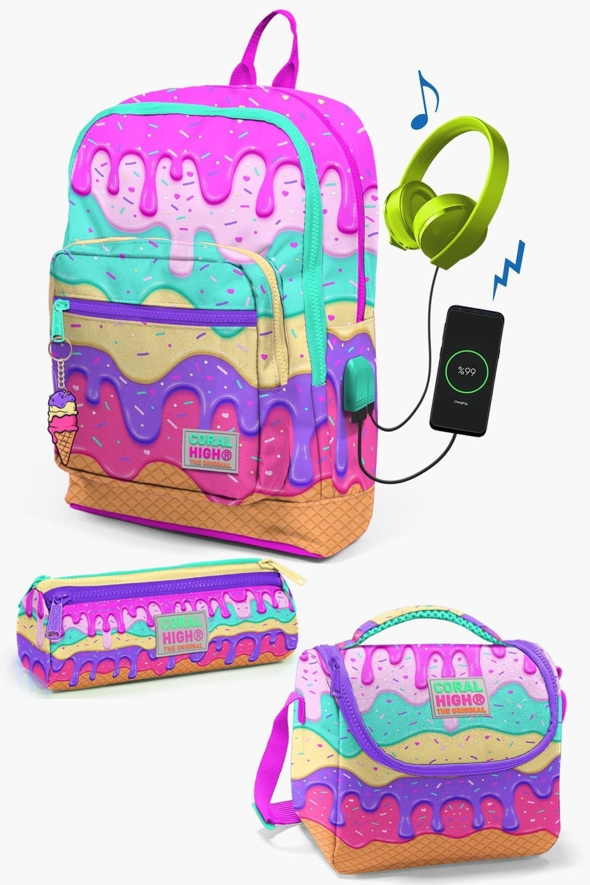 Kids Pink Colorful Ice Cream Patterned Usb 3 Pcs School Bag Set Set0123831
