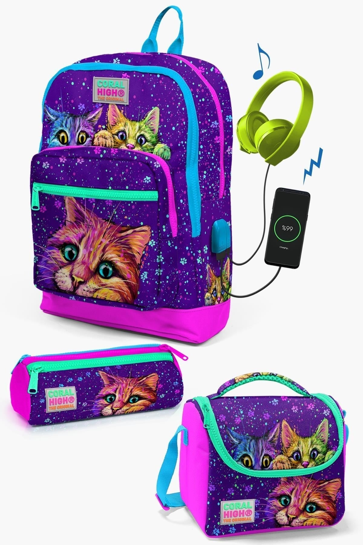 Kids Purple Pink Cat Patterned Usb 3-Piece School Bag Set Set0123832