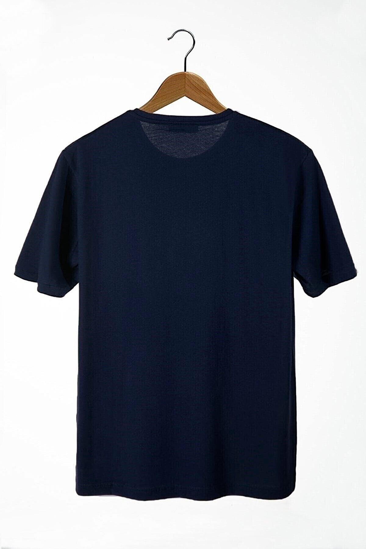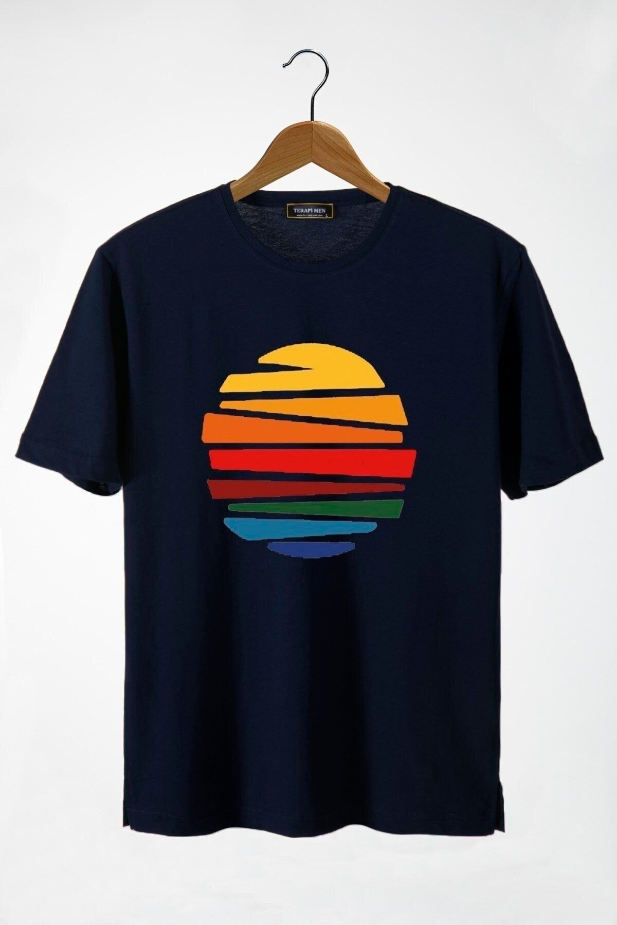 Men'S Navy Blue Sun Front Printed Crew Neck Oversize T-Shirt
