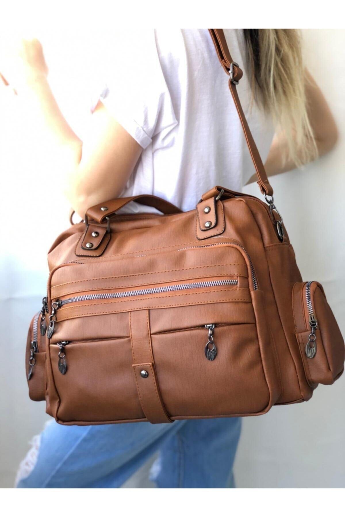 Samilon Women'S Tan Wash Leather Multi-Compartmental Shoulder And Handbag
