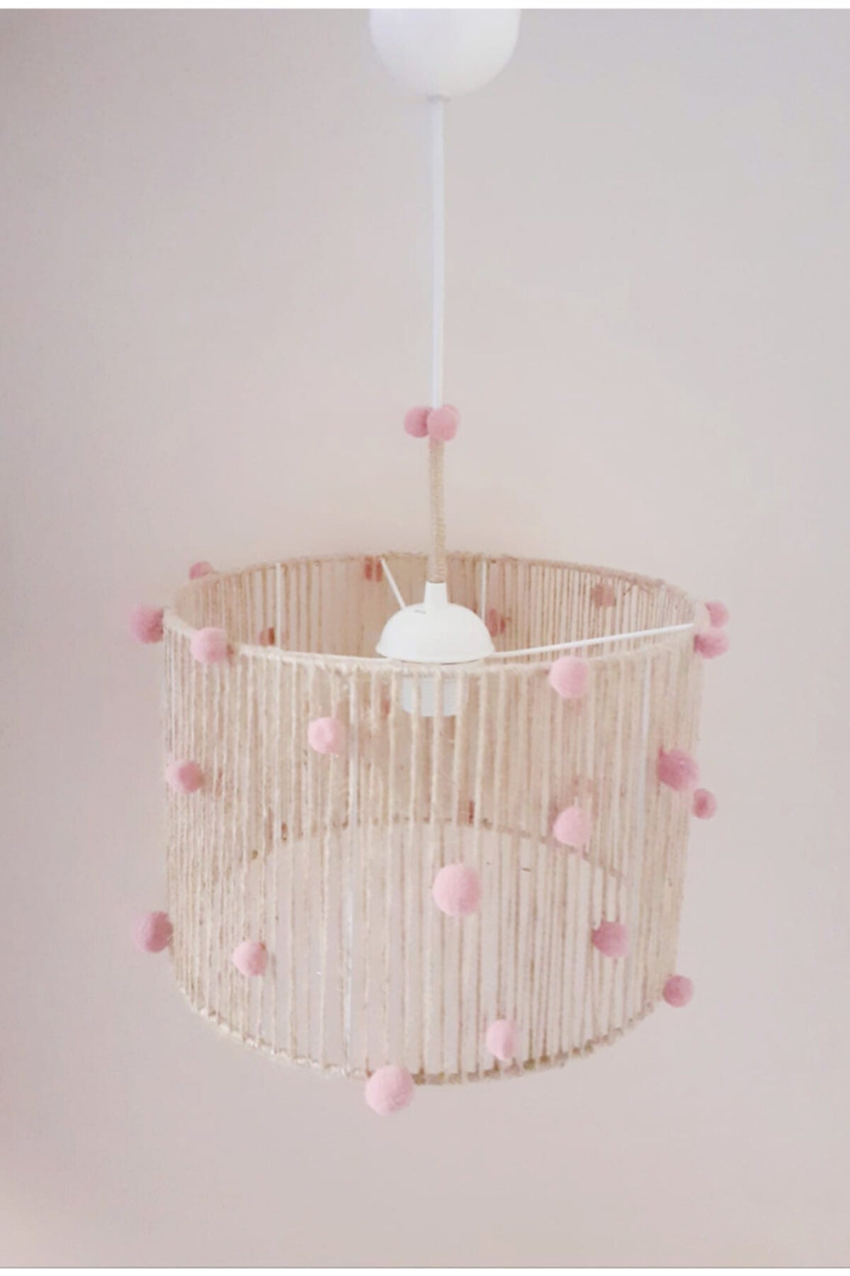 Wicker Rope Wrapped Pink Pompom Baby And Children'S Room Pendant Lamp Chandelier
