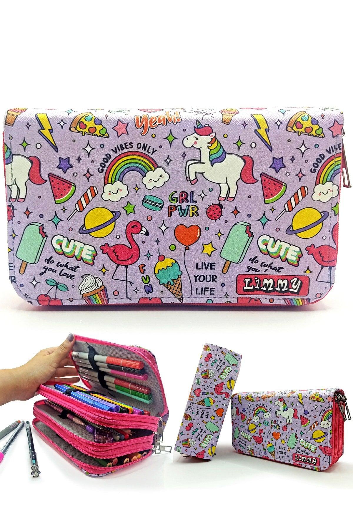 Pen Box Unicornio-Flamingo-Avakado Estampado Kawai Organizador Tres Sección Penlik