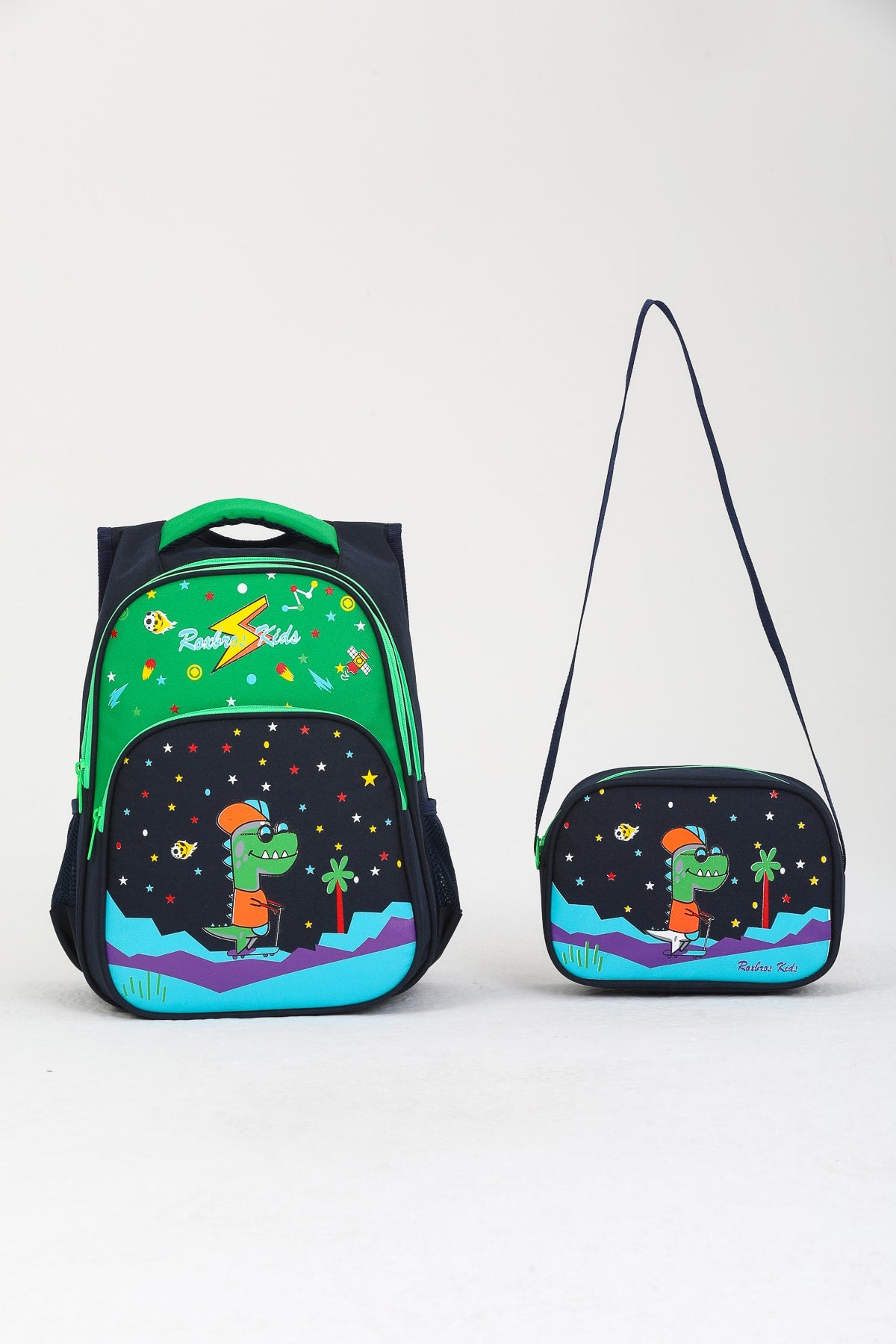 Roxbros dinosaur scooter primary school bag and lunch box # 3 pockets # 2 durable drinker pockets # dimensions: 43 c x 18 c x 33 cm # bag + lunch box weight: 600 gr ###### lunch box 1 zipper pocket # with shoulder strap note: don't contain cancerogens + phthalate-free + all products are invoiced. Improved version for clearer understanding and better search visibility. Suitable for users seeking detailed and reliable product information.